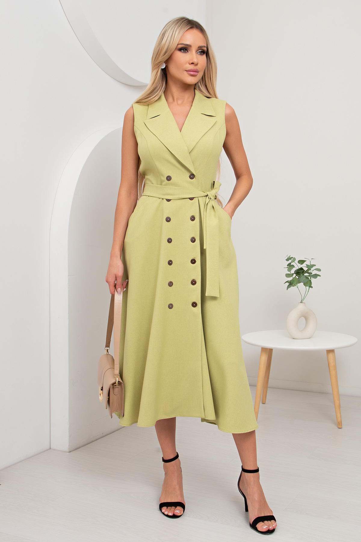 Элегантный сарафан приталенного силуэта, с английским воротником из плательно - костюмной ткани. По переду выполнена двубортная застежка на петли и пуговицы. Модель отрезная по линии талии, дополнена функциональными карманами. Пояс из основного материала в комплекте.