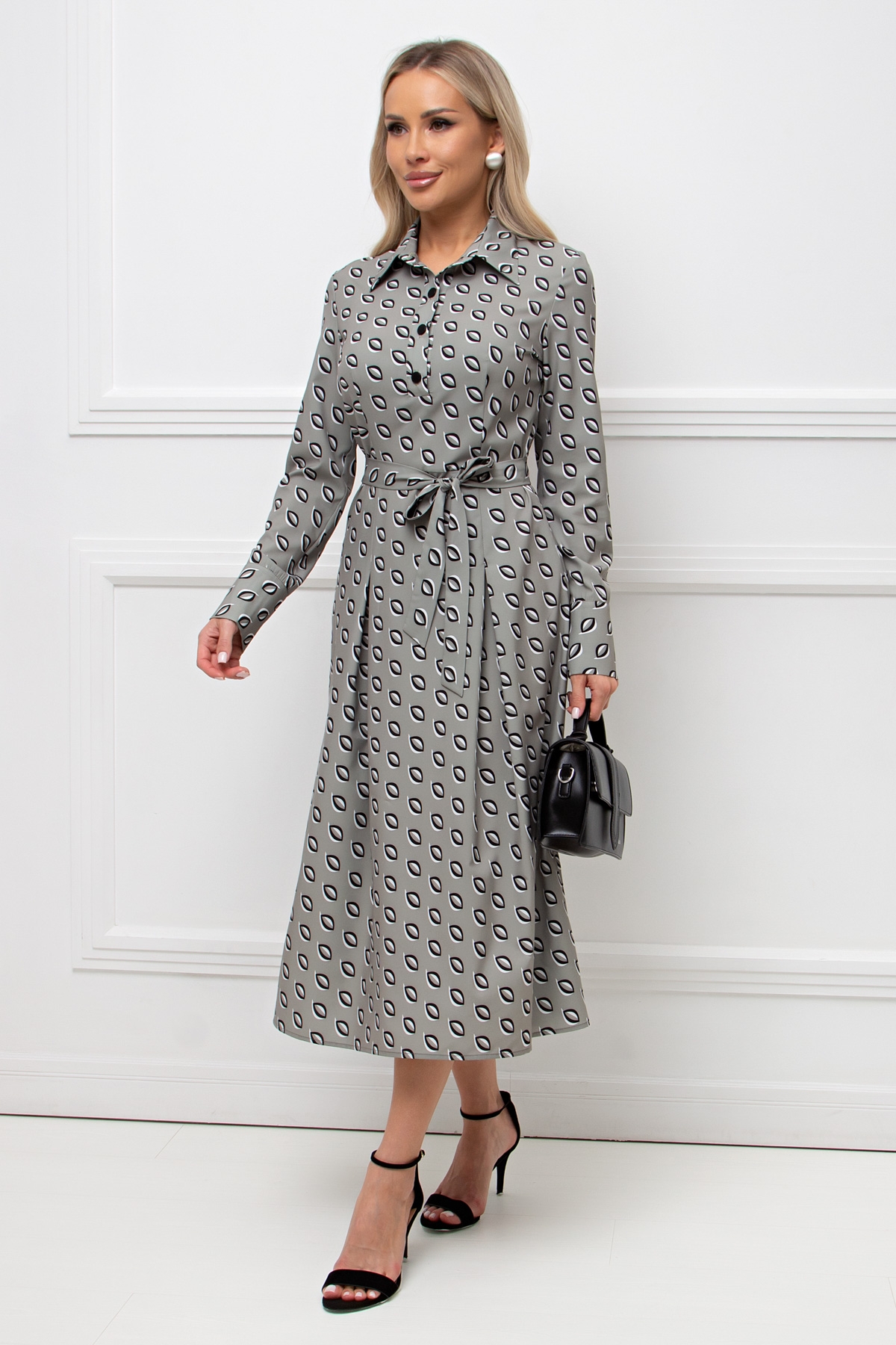 Женственное платье приталенного силуэта. Горловина оформлена отложным воротником на стойке. По переду втачная планка с застежкой на петли и пуговицы. Длинный втачной рукав оканчивается притачной манжетой. Модель отрезная по линии талии, с боку застежка на потайную молнию. Юбка дополнена встречными складками. Пояс из основной ткани в комплекте.