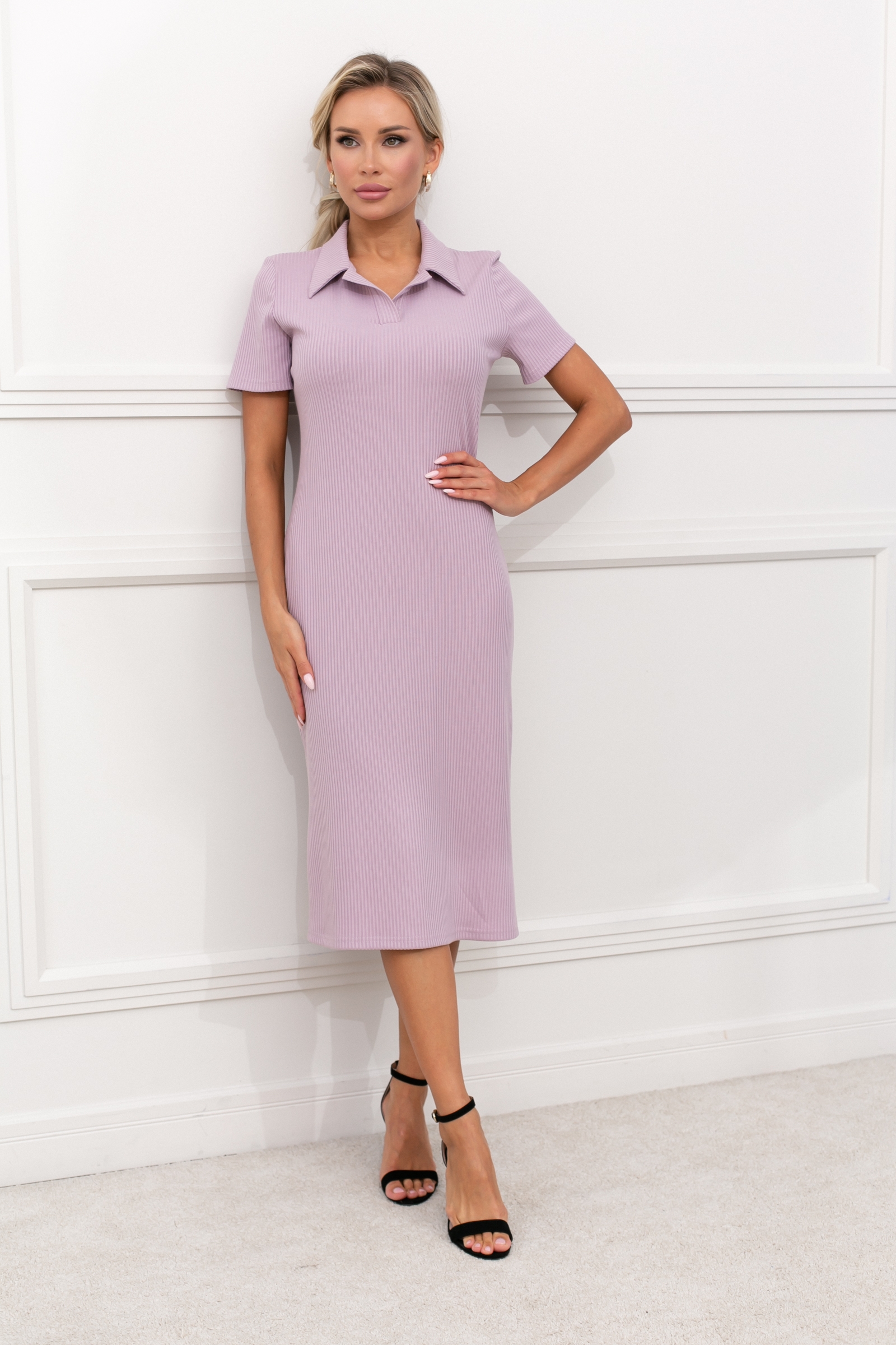 Удобное прилегающее платье из трикотажного полотна. V - образная горловина дополнена отложным воротником. Короткие втачные рукава. Низ ровный, без разрезов.