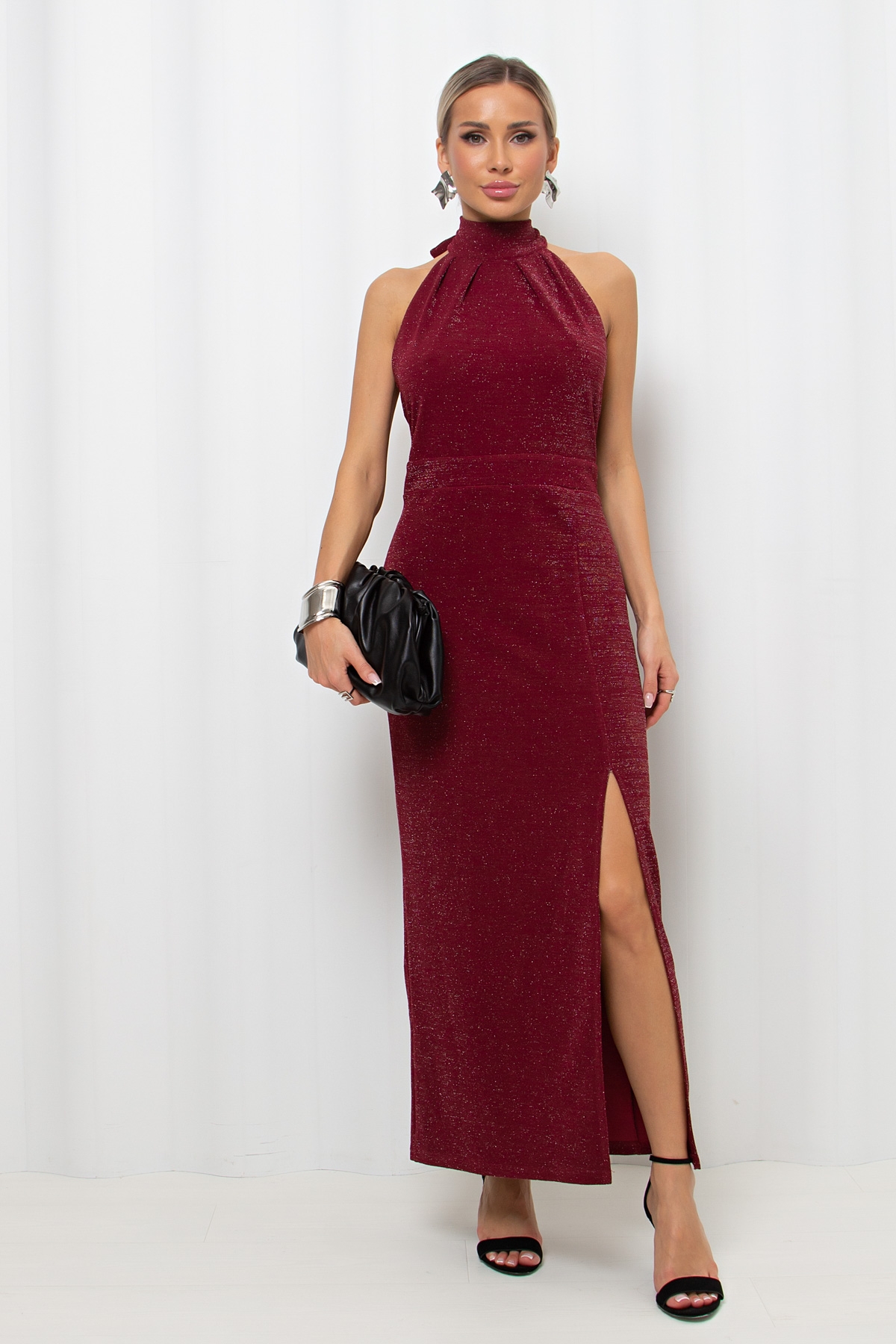 Элегантное вечернее платье прилегающего силуэта из трикотажного полотна с добавлением люрекса. Горловина оформлена воротником-стойка с завязками на шее. Плечи и спина открыты. Сзади застежка на потайную молнию. Низ ровный, по переднему рельефу разрез.