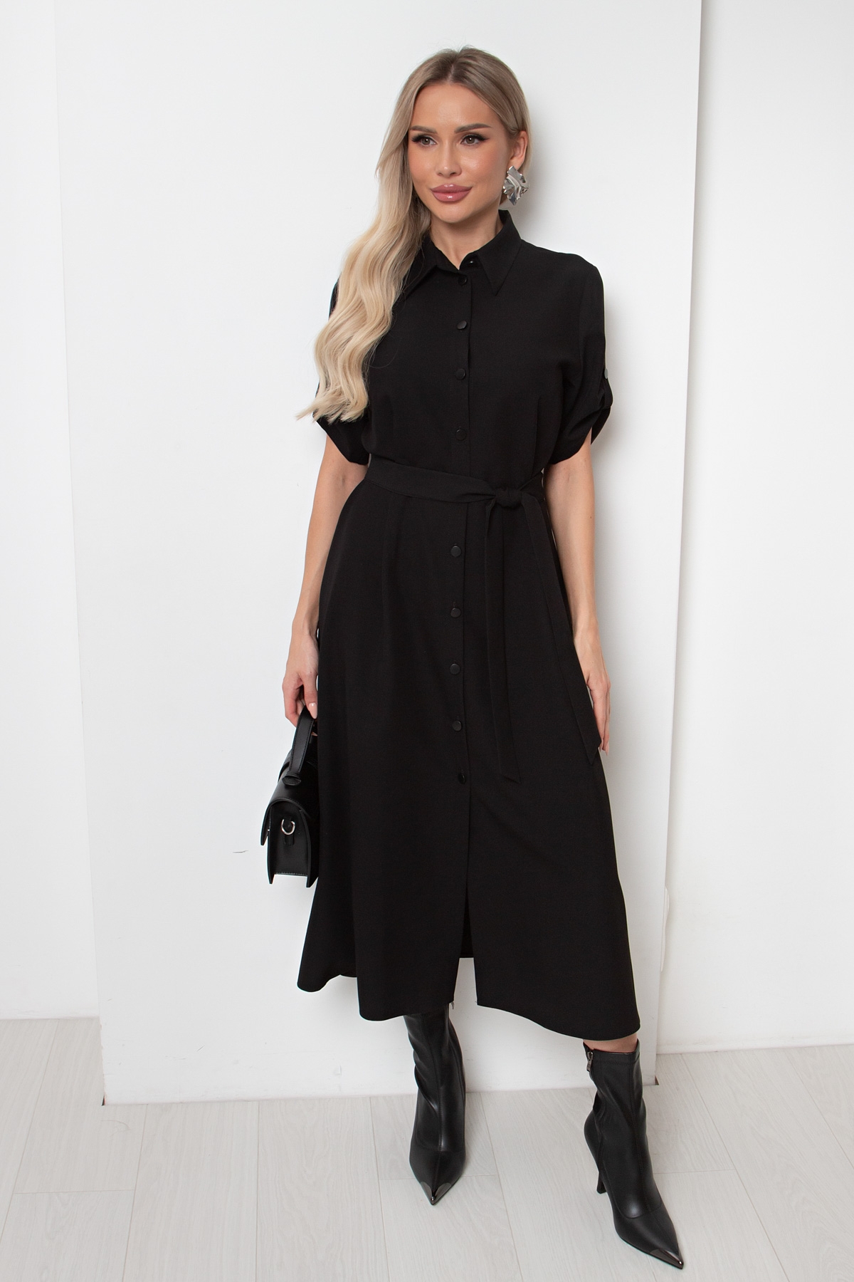 Элегантное платье А-силуэта. Горловина оформлена отложным воротником на стойке, по переду планка с застежкой на петли и пуговицы. Втачной короткий рукав присобран на пату. Низ ровный, без разрезов. Пояс из основной ткани в комплекте. Отличный вариант для офиса.