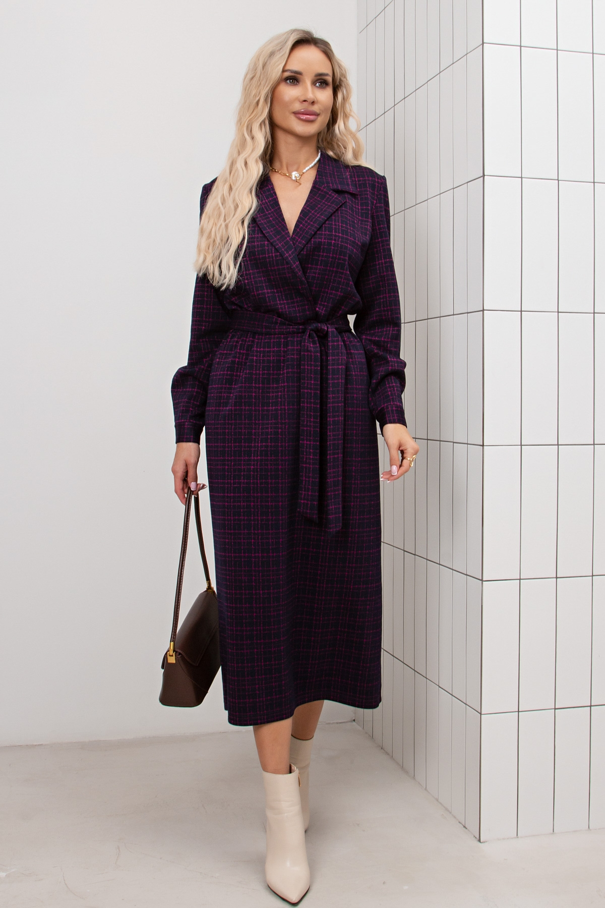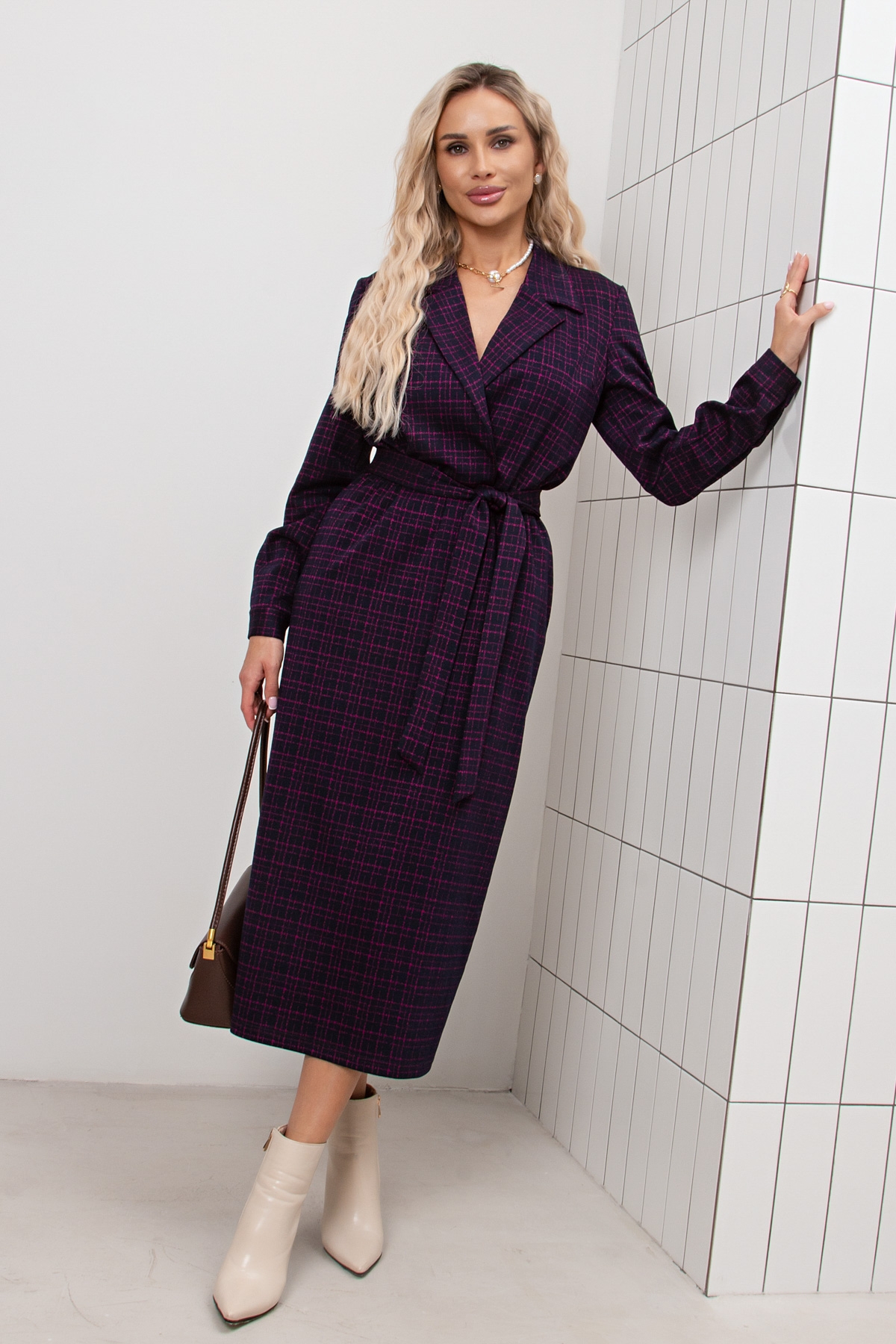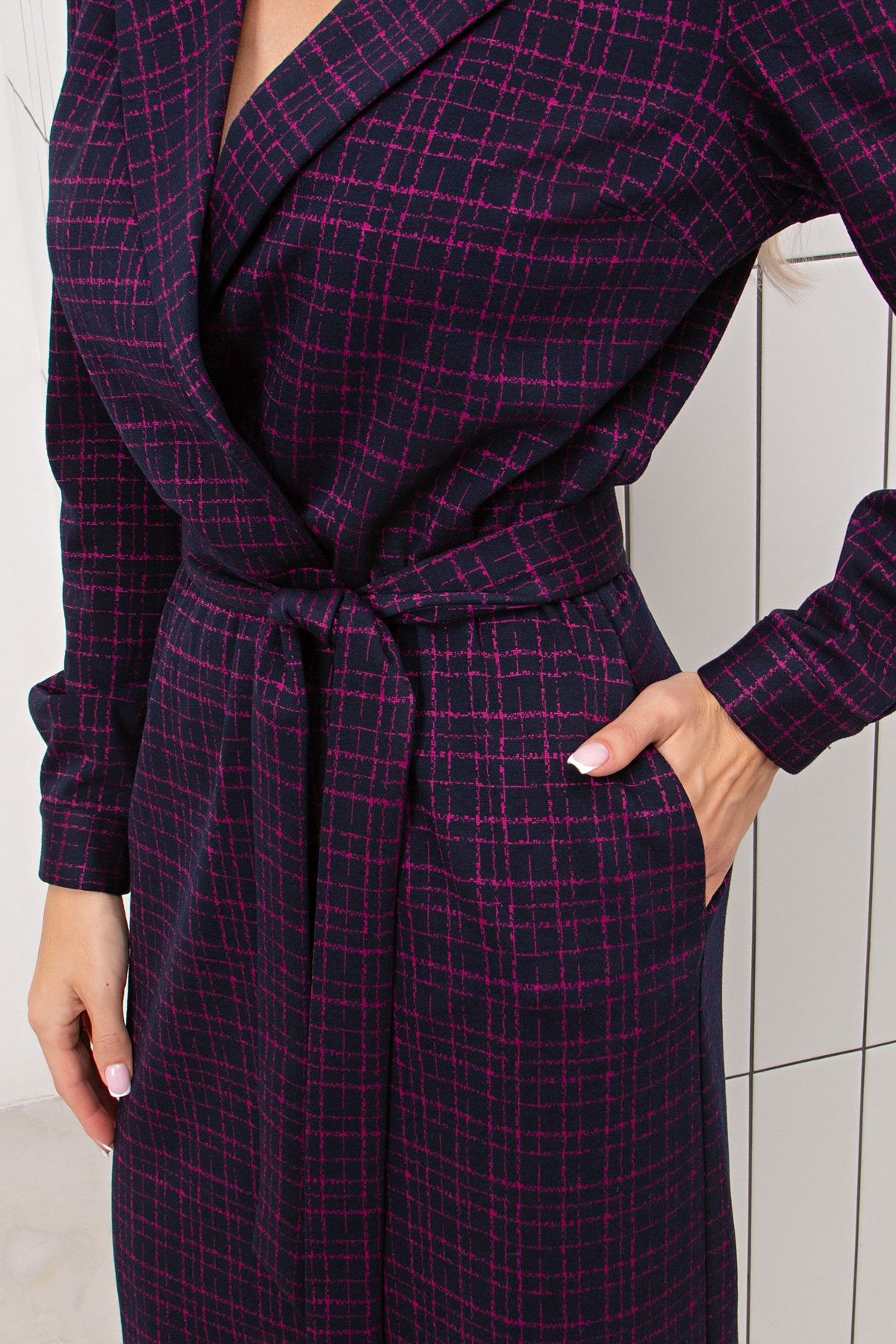 Женственное платье полуприлегающего силуэта из трикотажного полотна. Лиф переда на запах. V - образная горловина с отложным воротником пиджачного типа. Втачной рукав оканчивается притачным манжетам. Модель отрезная по линии талии присобрана на эластичную резинку. В боковых швах юбки функциональные карманы. Пояс из основного материала в комплекте.