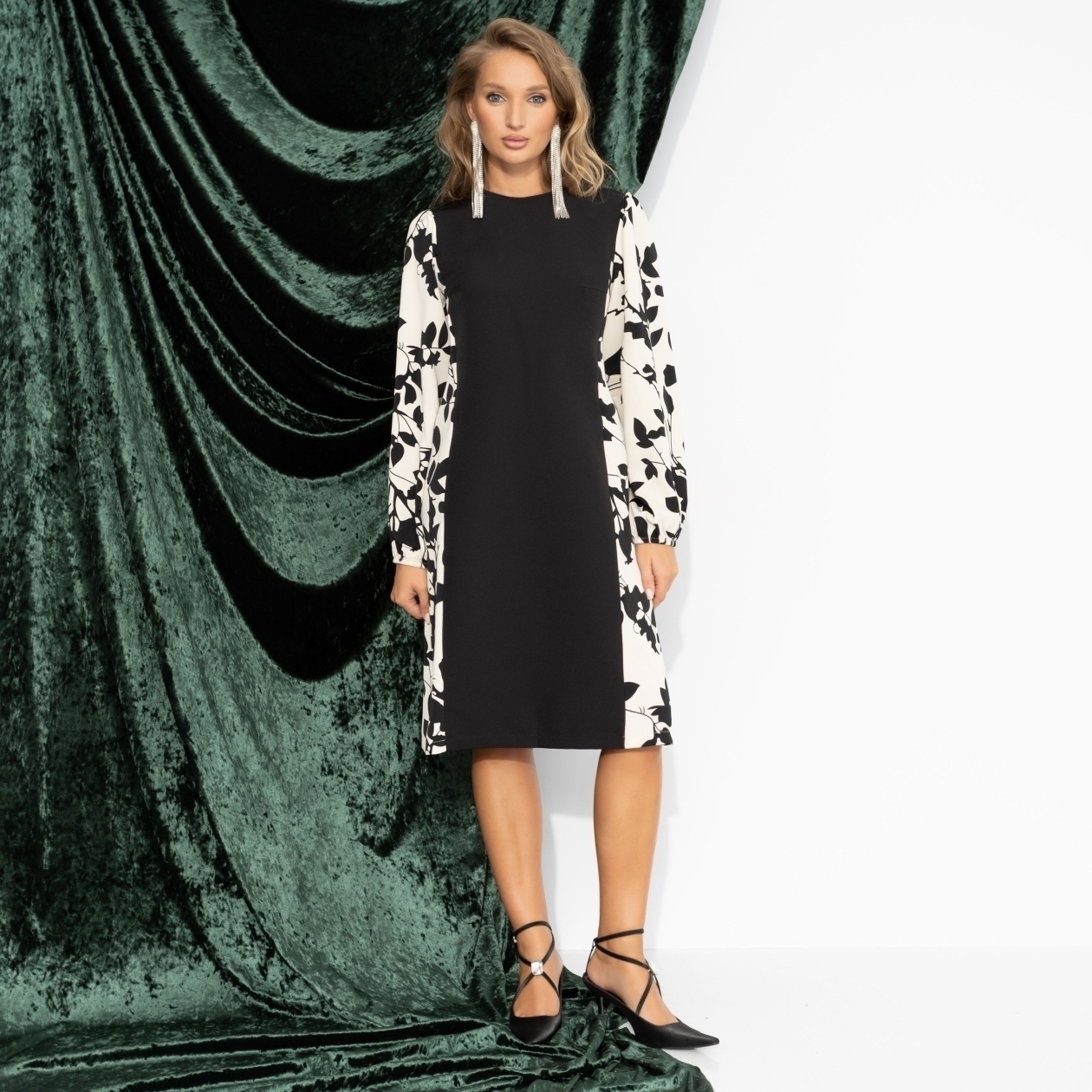 Быть знаменитостью – значит просто быть собой. Шёлк скользит по коже, даря ощущение уверенности. Контраст чёрного и белого создаёт кадр, в котором ты и есть – главный акцент. Платье прямого кроя с разрезом по спинке. Подол асимметричный. Застежка на пуговицу.