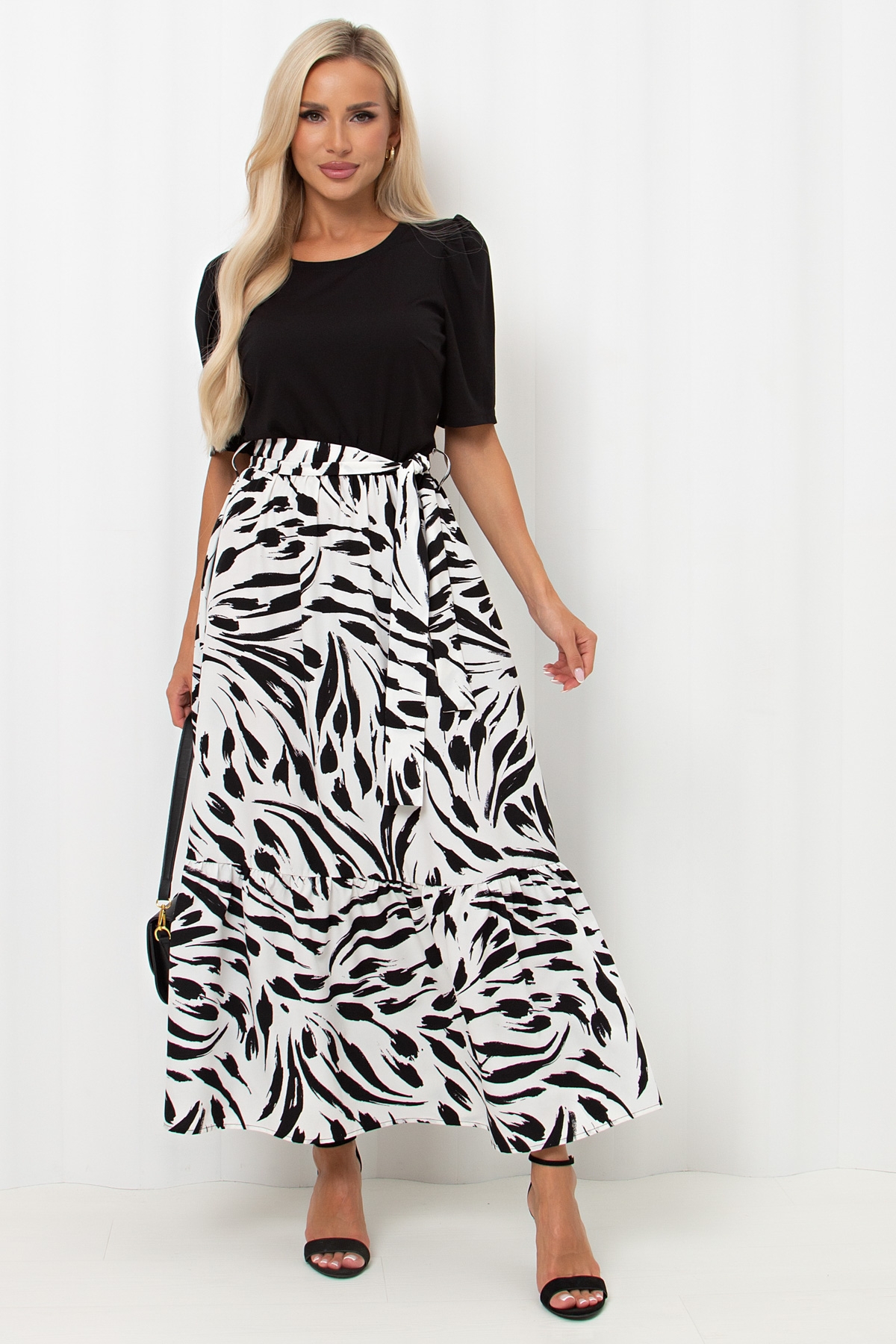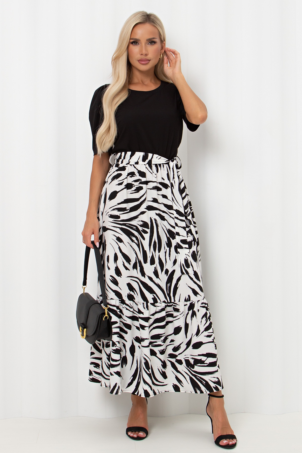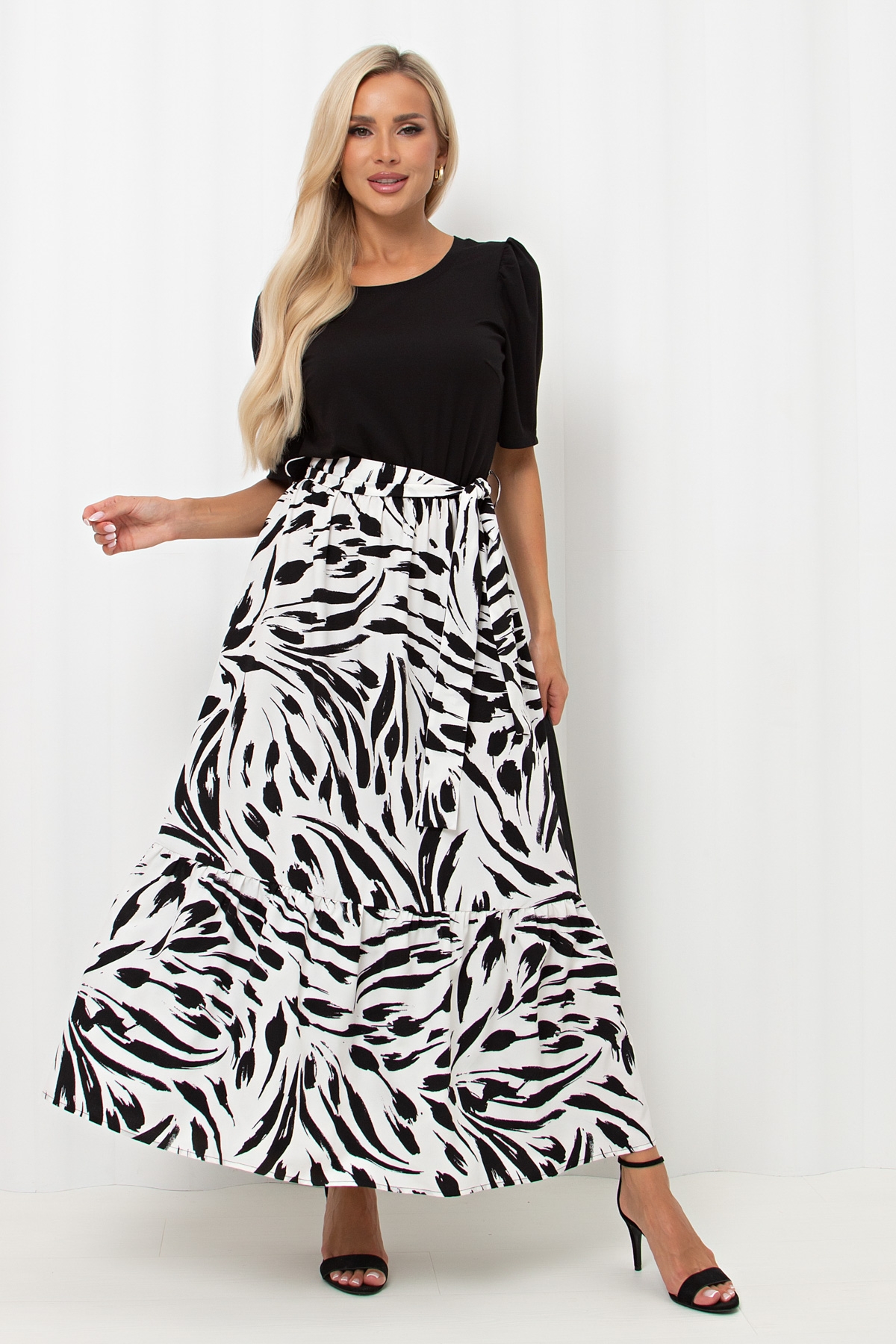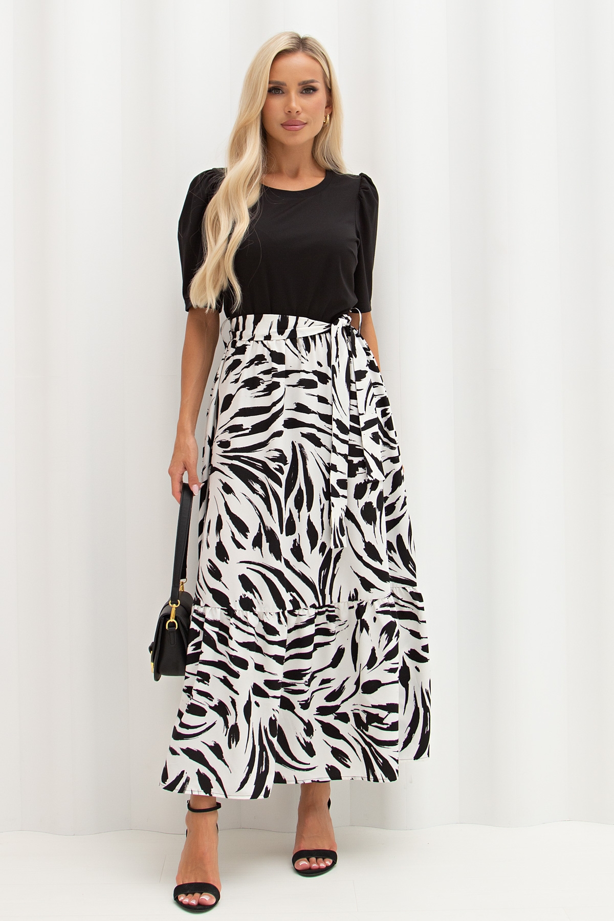 Платье приталенного силуэта. Верхняя часть платья из трикотажного полотна, нижняя из легкой ткани Ниагара. Округлая горловина на внешней обтачке. Втачной рукав фонарик. Отрезная линия талии. Низ оформлен притачным воланом. Пояс из основного материала в комплекте.