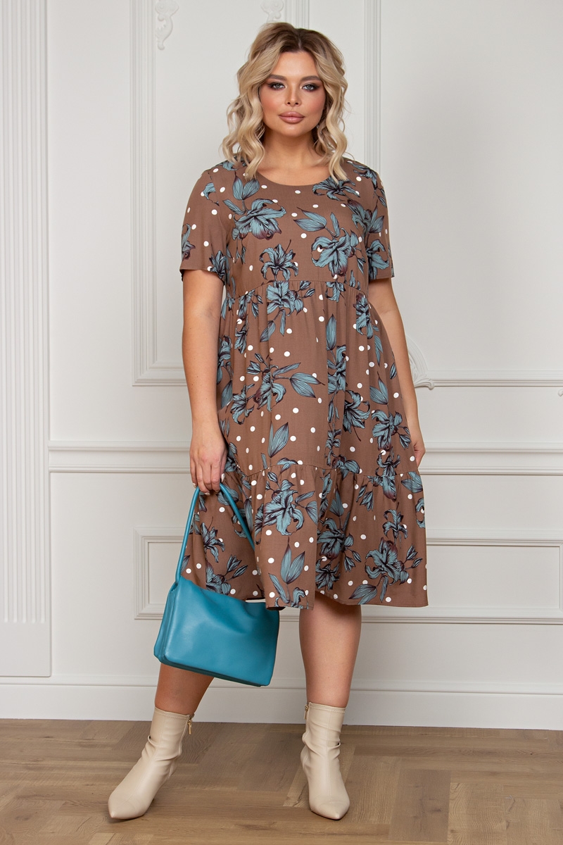 Комфортное платье прямого силуэта из натурального полотна с цветочным принтом. Круглая горловина на внутренней обтачке. Короткий втачной рукав. Модель отрезная выше линии талии. Юбка оформлена двумя рядами оборок. Модель без застежки. Низ ровный, без разрезов.