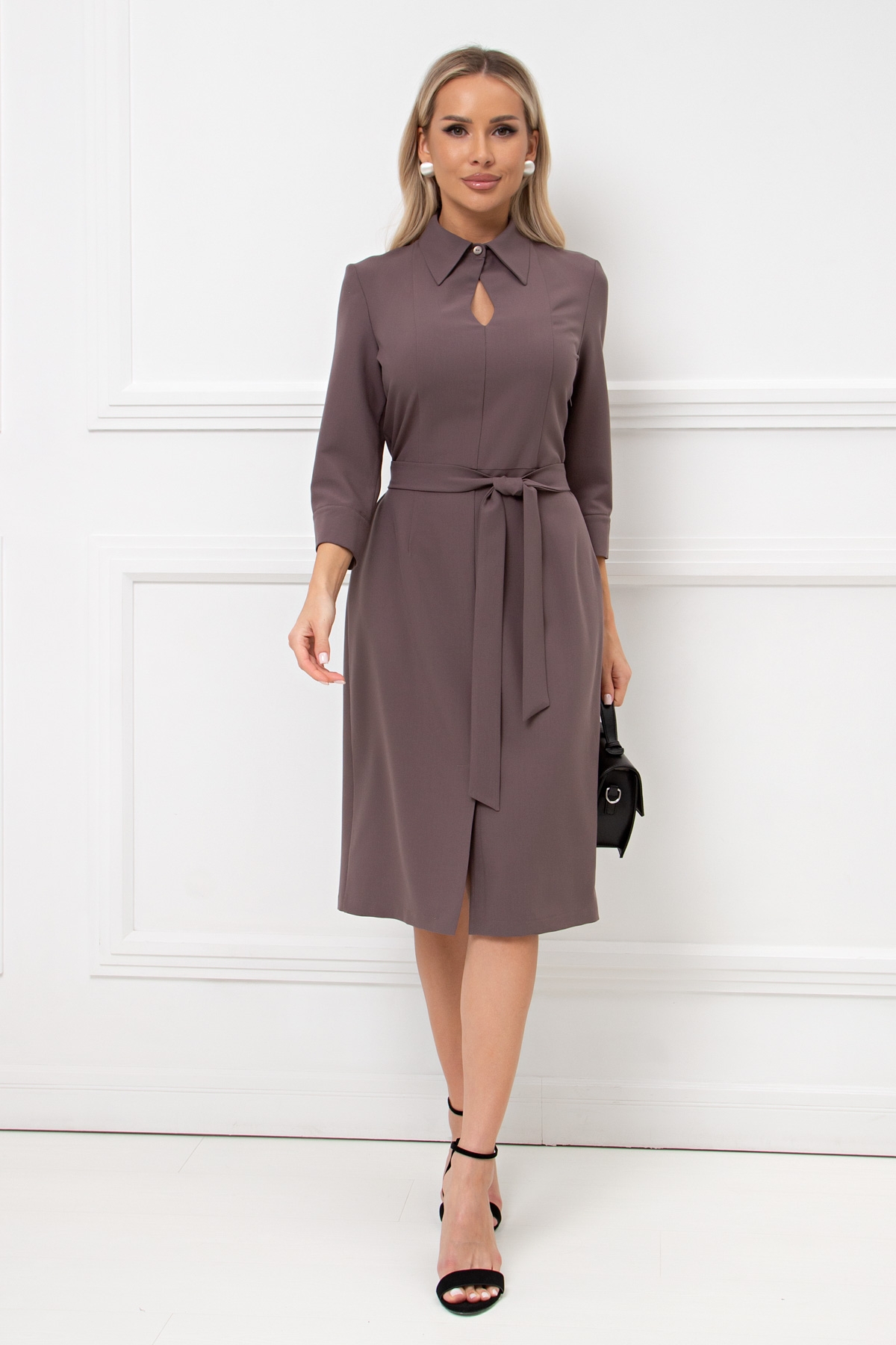 Женственное платье полуприлегающего силуэта изготовлено из плательно-костюмной ткани. Горловина оформлена отложным воротником на стойке переходящим в вырез-капелька. Втачной рукав длиной 7/8 с притачной манжетой. Модель отрезная по линии талии. В боковом шве застежка на потайную молнию. Низ ровный, по переду шлица. Пояс из основной ткани в комплекте.
