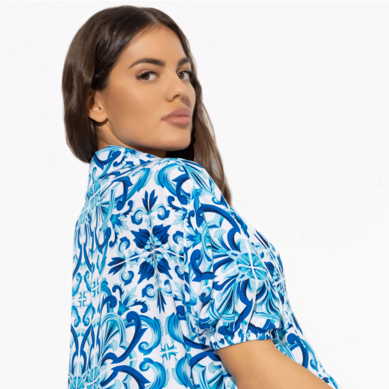 Вечеринка в загородном отеле. Пока другие ломают голову над образом, ты определилась с выбором. Сложный принт и легкий голубой оттенок – лучший вариант сохранять свежесть образа и дышать полной грудью. Платье из 100% вискозы. Длина чуть выше колена на средний рост. Свободная посадка на любую фигуру. Легкие воланы по подолу платья. Рукав до середины плеча. Пуговицы по всей длине платья.