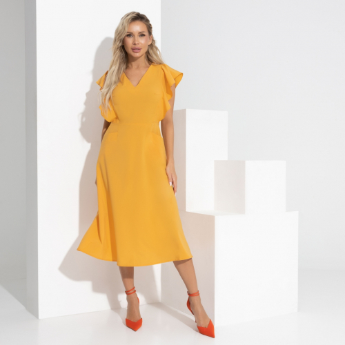 Длина платья чуть выше колена подходит для среднего роста, а свободная посадка обеспечивает комфорт и подходит для любой фигуры. Легкие воланы по подолу платья добавляют игривости и женственности, создавая воздушный и романтичный образ. Рукав до середины плеча и пуговицы по всей длине платья придают ему дополнительную элегантность и стиль.