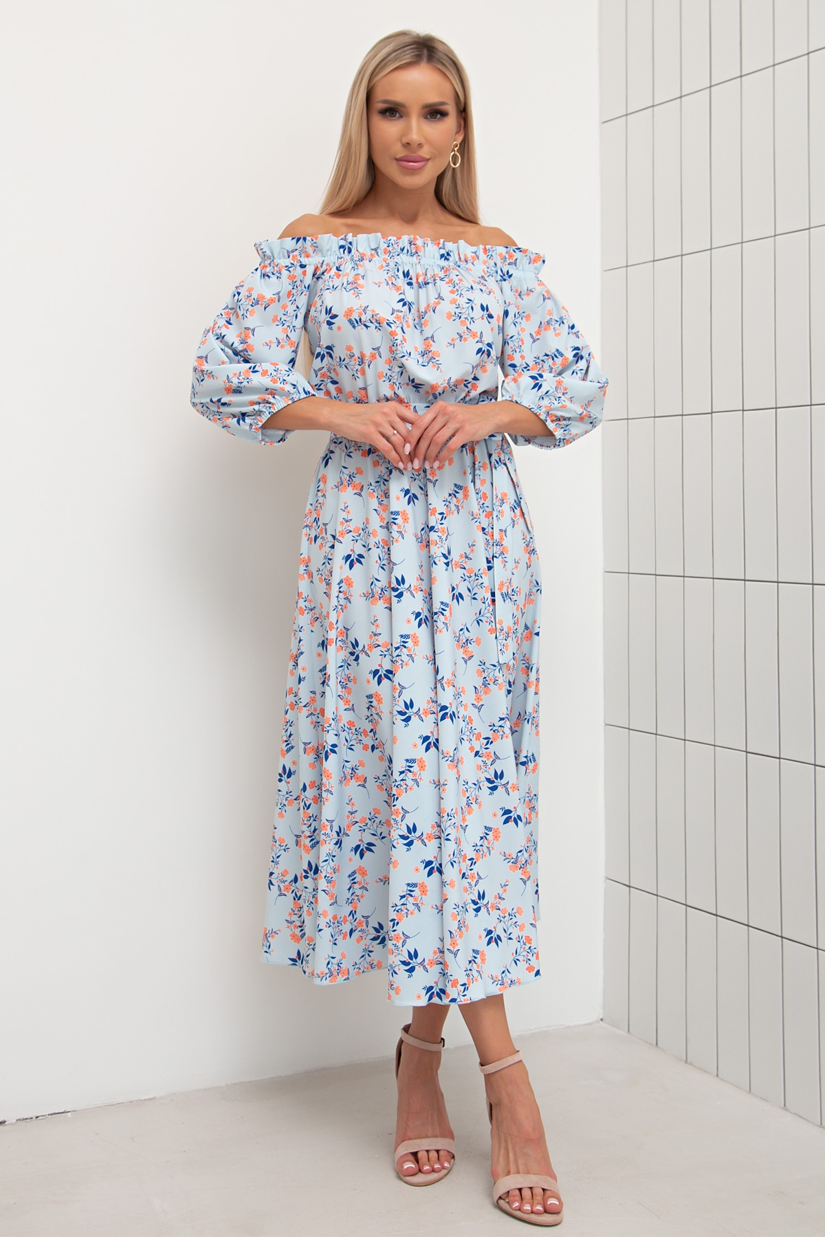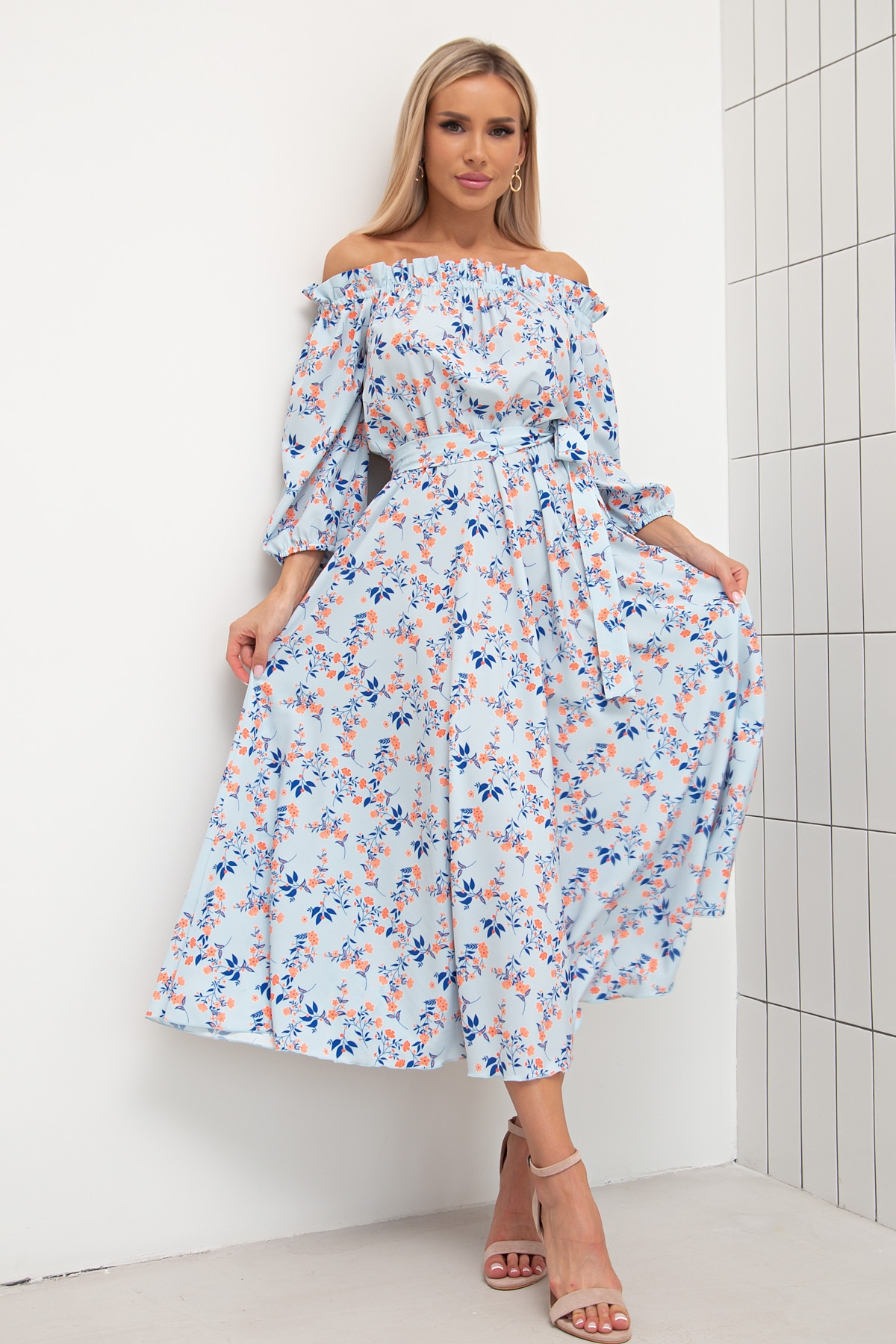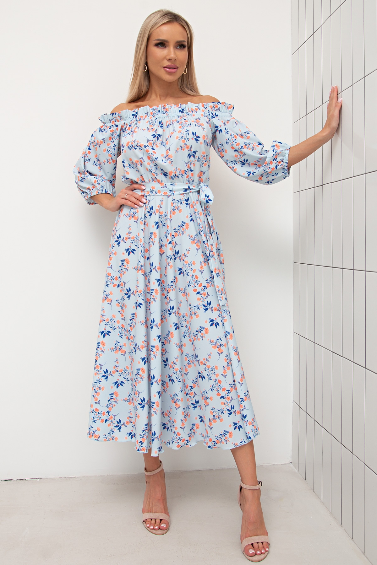 Платье приталенного силуэта. Глубокий вырез горловины собран на эластичную ленту. Платье можно носить в двух вариантах с открытыми и закрытыми плечами. Нижняя часть рукава и окружность талии собрана на эластичную резинку. Расклешенная юбка будет эффектно струится при ходьбе. Пояс из основного материала в комплекте.
