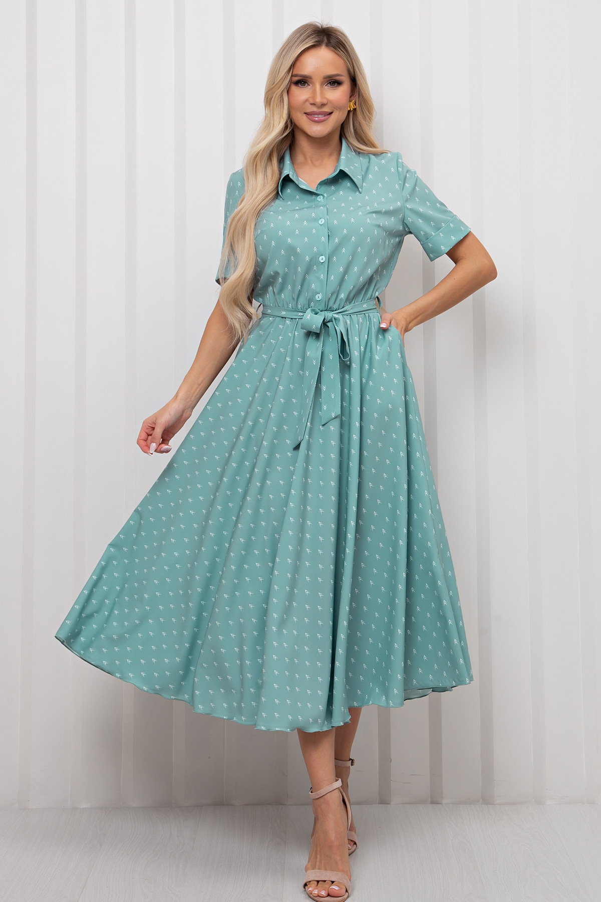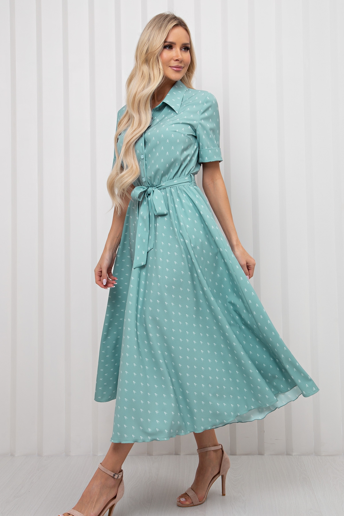 Женственное платье приталенного силуэта из легкой ткани с оригинальным принтом. Втачной короткий рукав оканчивается притачной манжетой с отворотом. Горловина оформлена классическим воротником на стойке. По переду выполнена планка с застежкой на петли и пуговицы. Модель отрезная по линии талии, присборена на эластичную резинку и дополнена шлевками под пояс. По бокам функциональные карманы. Низ ровный, без разрезов. Пояс из основного материала в комплекте.