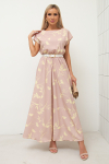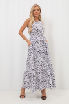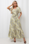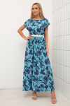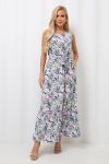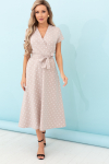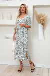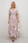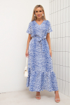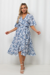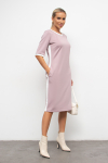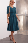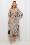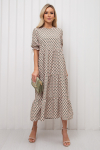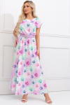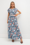 Комфортное платье прямого силуэта из меланжевого трикотажа с цветочным принтом и принтом "горох". Круглая горловина на внутренней обтачке. В боковых швах расположены функциональные карманы. Втачной рукав 3/4. Модель отрезная выше линии талии. Юбка оформлена одним рядом оборок. Модель без застежки. Низ ровный, без разрезов.
