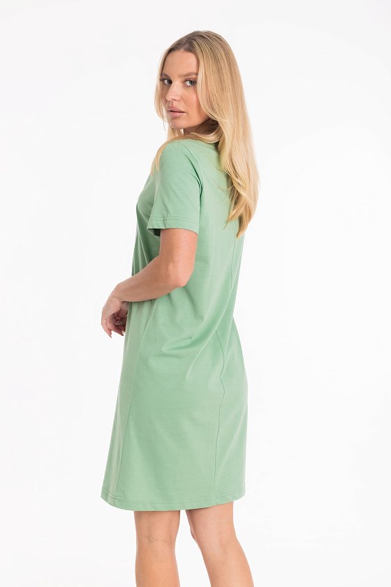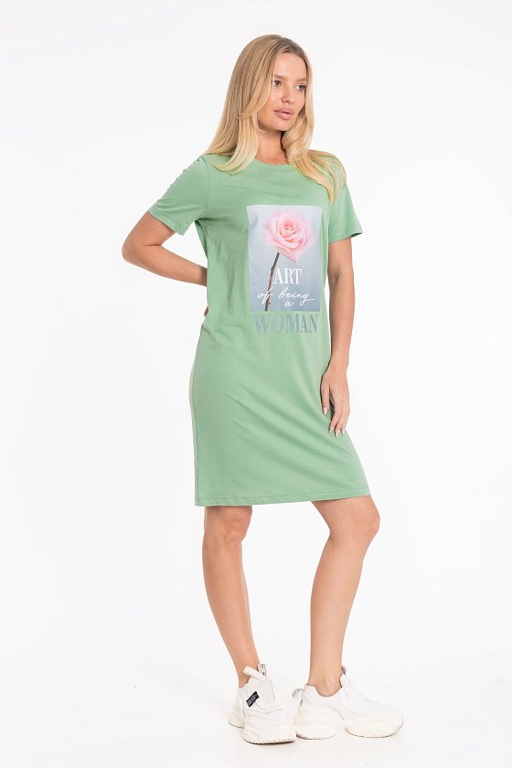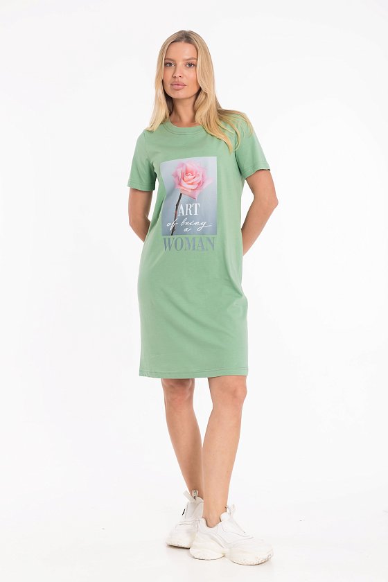 Платье выполнено из хлопкового полотна. Модель прямого кроя с короткими рукавами и круглым вырезом горловины, оформленным планкой. Спереди украшено стильным принтом, что придаёт образу яркость и индивидуальность.