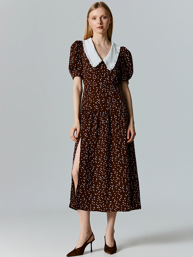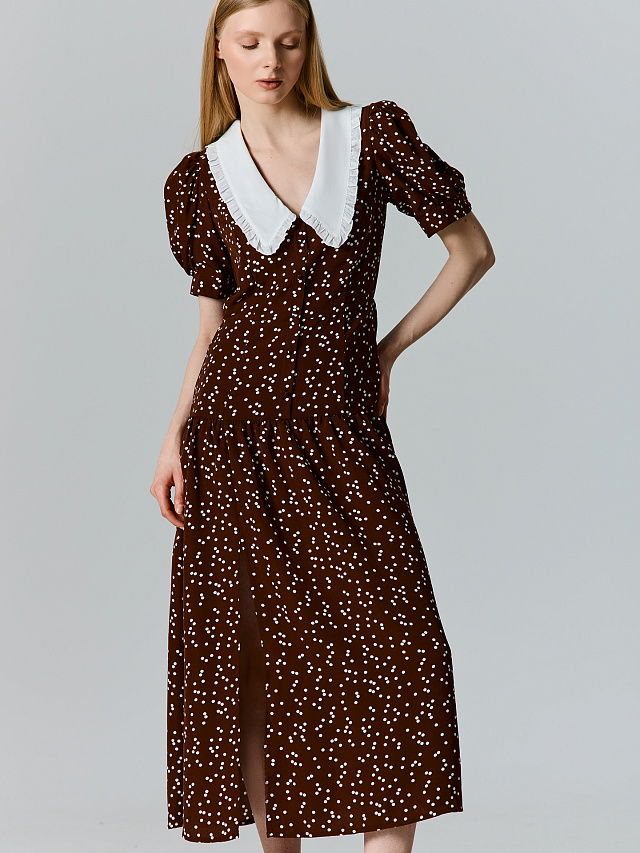 Платье миди в мелкий бежевый горошек станет вашим универсальным решением. Приталенный крой мягко подчеркивает линию талии, создавая аккуратный и женственный силуэт. Классическая длина и нежный воротничок делают его подходящим как для повседневной носки, так и для торжественных моментов.