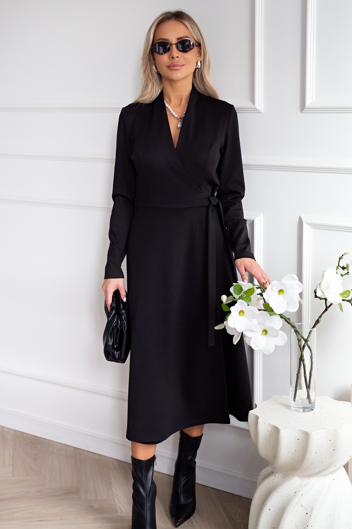 Женственное платье приталенного силуэта изготовлено из трикотажного полотна.V-образная горловина с цельнокроеной стойкой. Длинный втачной рукав. Модель отрезная по линии талии на запахе, сбоку пояс-завязка. Низ ровный, без разрезов.