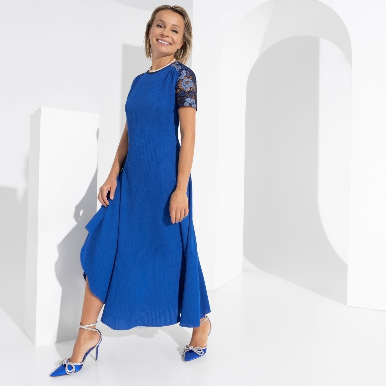Это платье идеального кроя. Оно «вытягивает» фигуру, визуально делая вас выше и стройнее. В платье четко прослеживается тренд на длину макси. Вставка на юбке добавляет пикантный и модный акцент.