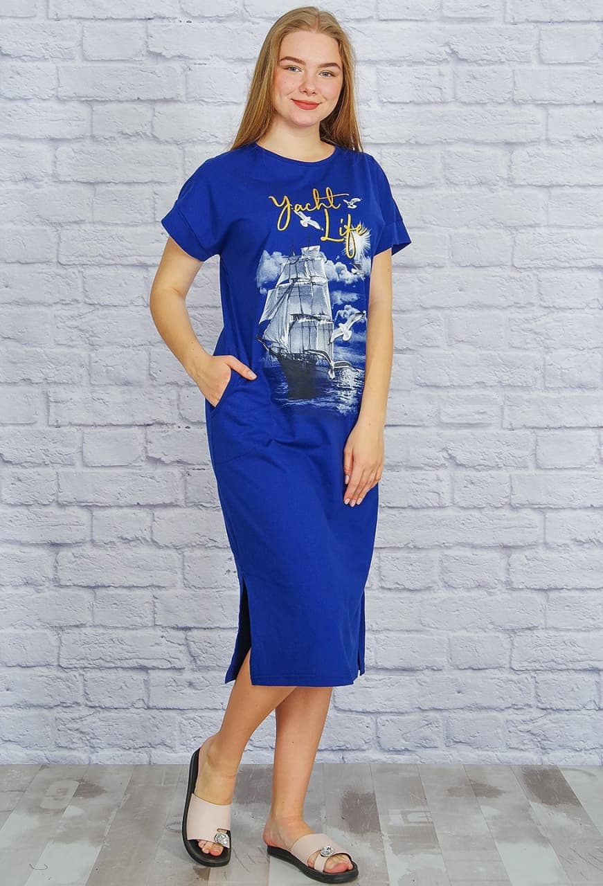 Платье прямого кроя из мягкого кулирного полотна. Рукав спущенный с манжетом. По бокам карманы, снизу небольшие разрезы. Красивый "морской" принт настраивает на романтичный лад.