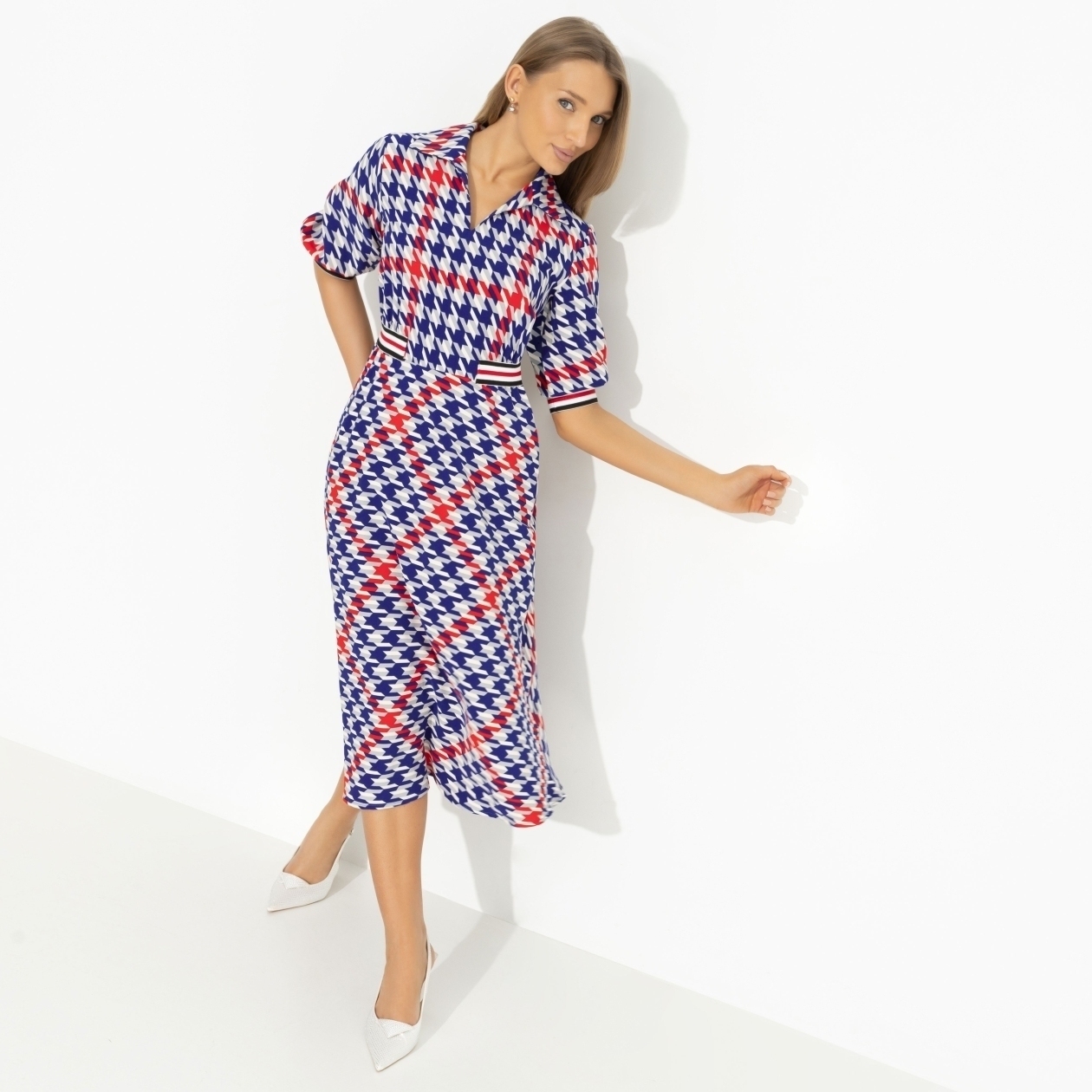 Гусиная лапка вышла на новый модный уровень. Из монохромного орнамента она превратилась в яркий принт благодаря дизайнерам CHARUTTI. Теперь платье будет видно издалека. Платье приталенного силуэта в длине миди. Акцент из контрастной резинки на талии и на рукавах изделия. Ворот в стиле поло.