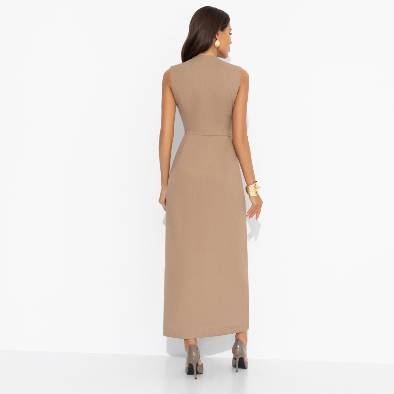 В зале становится тише. Платье, которое отменяет конкуренцию и включает поклонение. Ты не ищешь внимания, ты – его первоисточник.Платье в длине макси. Есть карманы. Приталенный силуэт изделия. Застегивается на пуговицу. За счет нахлеста есть глубокий разрез по юбке.