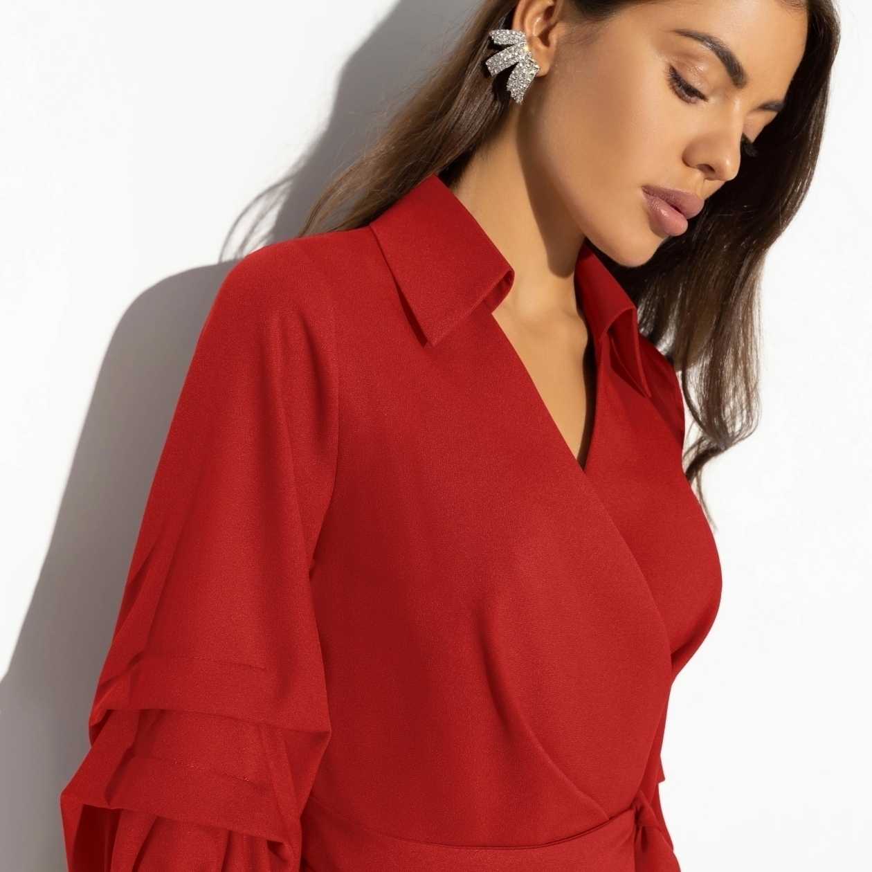 Праздники придут незаметно – и ты подумаешь: «Как хорошо, что я купила это чудесное красное платье для вечеринки заранее». Платье для смелых! Страсть как она есть. Струящаяся ткань, глубокий цвет страсти, выигрышная модель. Отдельно отметим сложный рукав и многослойную юбку. Можно восходить на трон! Просто вынуть его из шкафа, надеть – и ты королева.