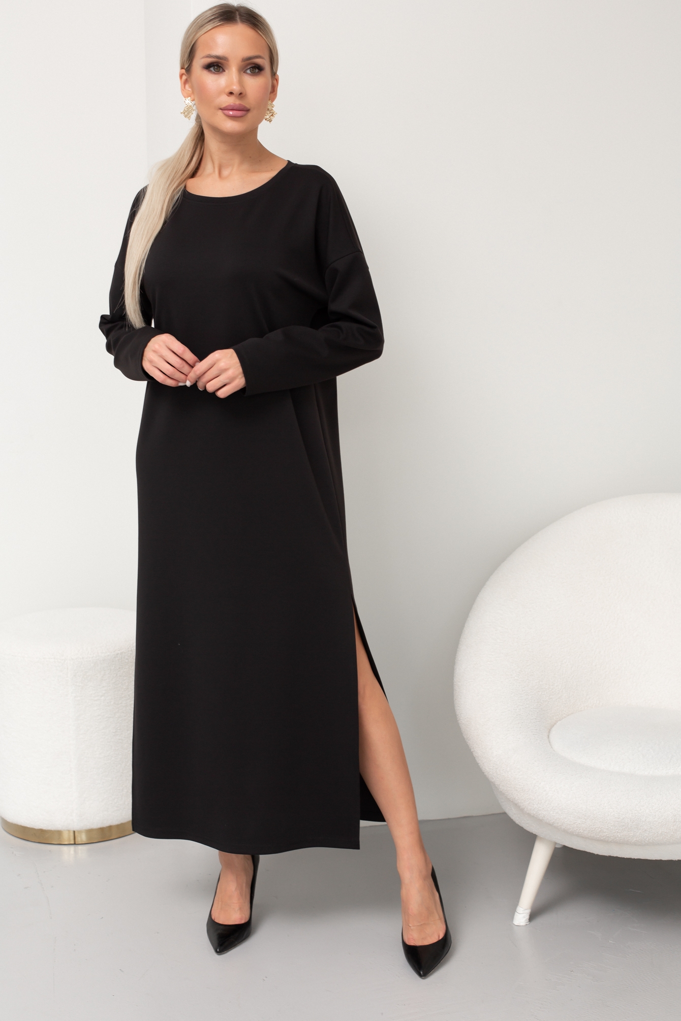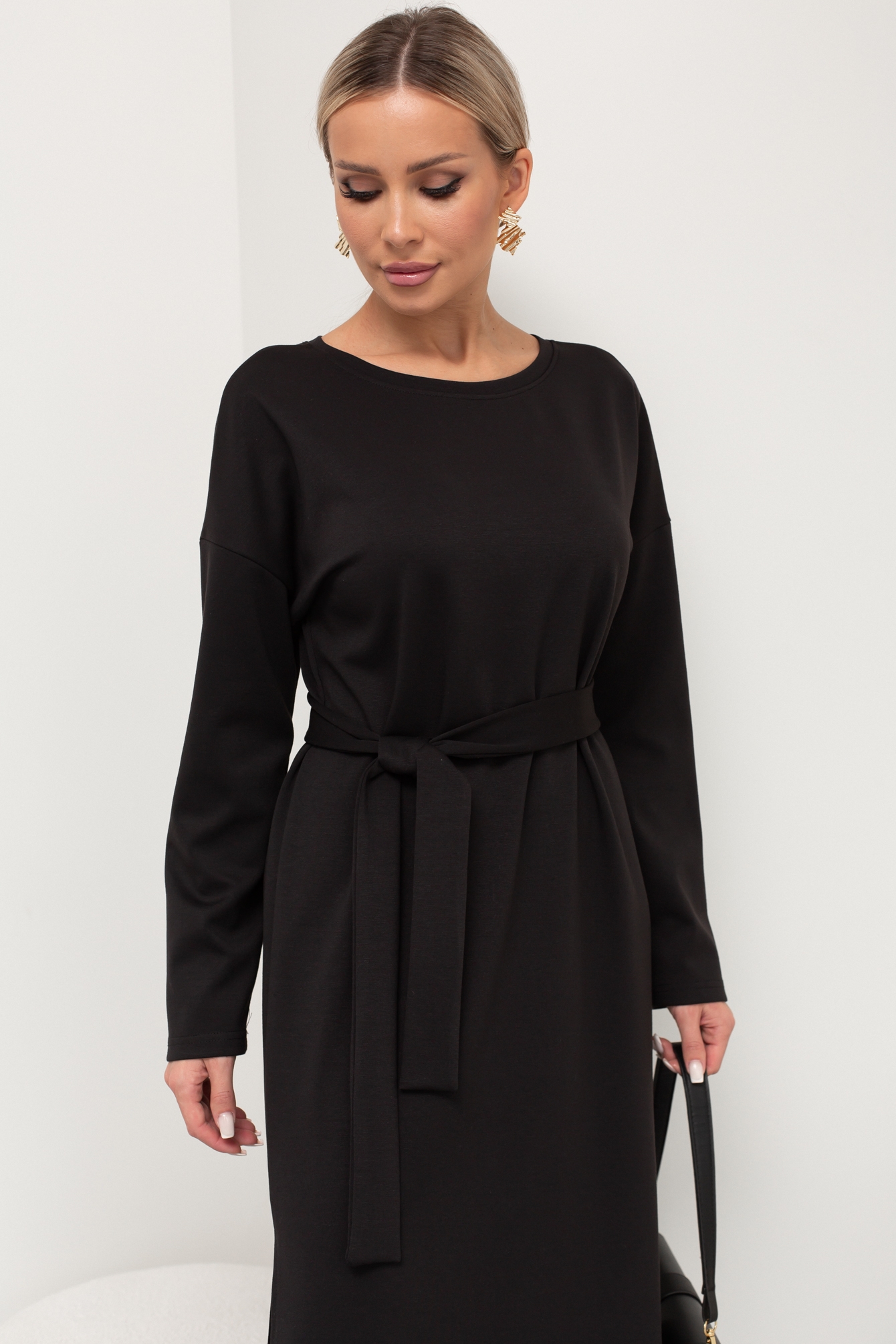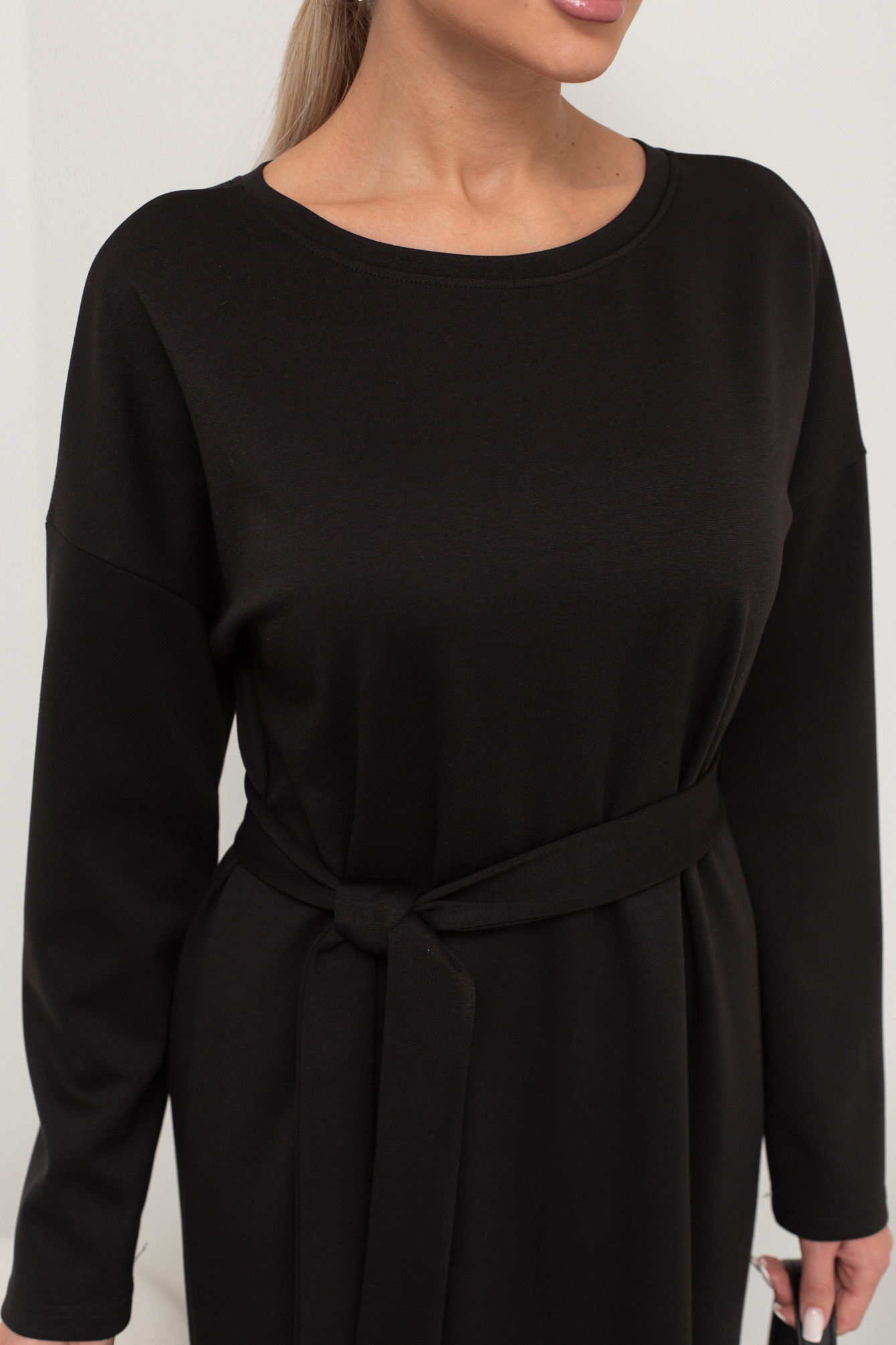 Удобное платье прямого кроя из однотонного трикотажного полотна. Длинный рукав со спущенным плечом. Округлая горловина на обтачке. Низ ровный, по бокам разрезы. Пояс из основной ткани в комплекте.