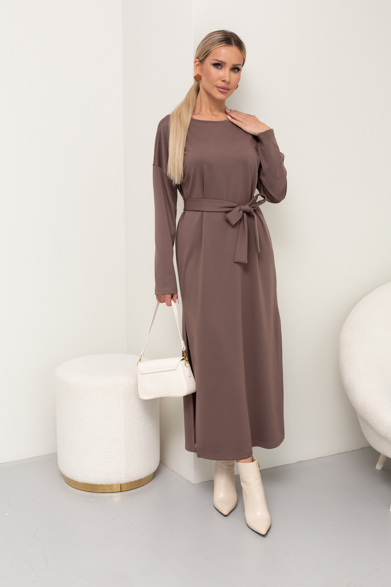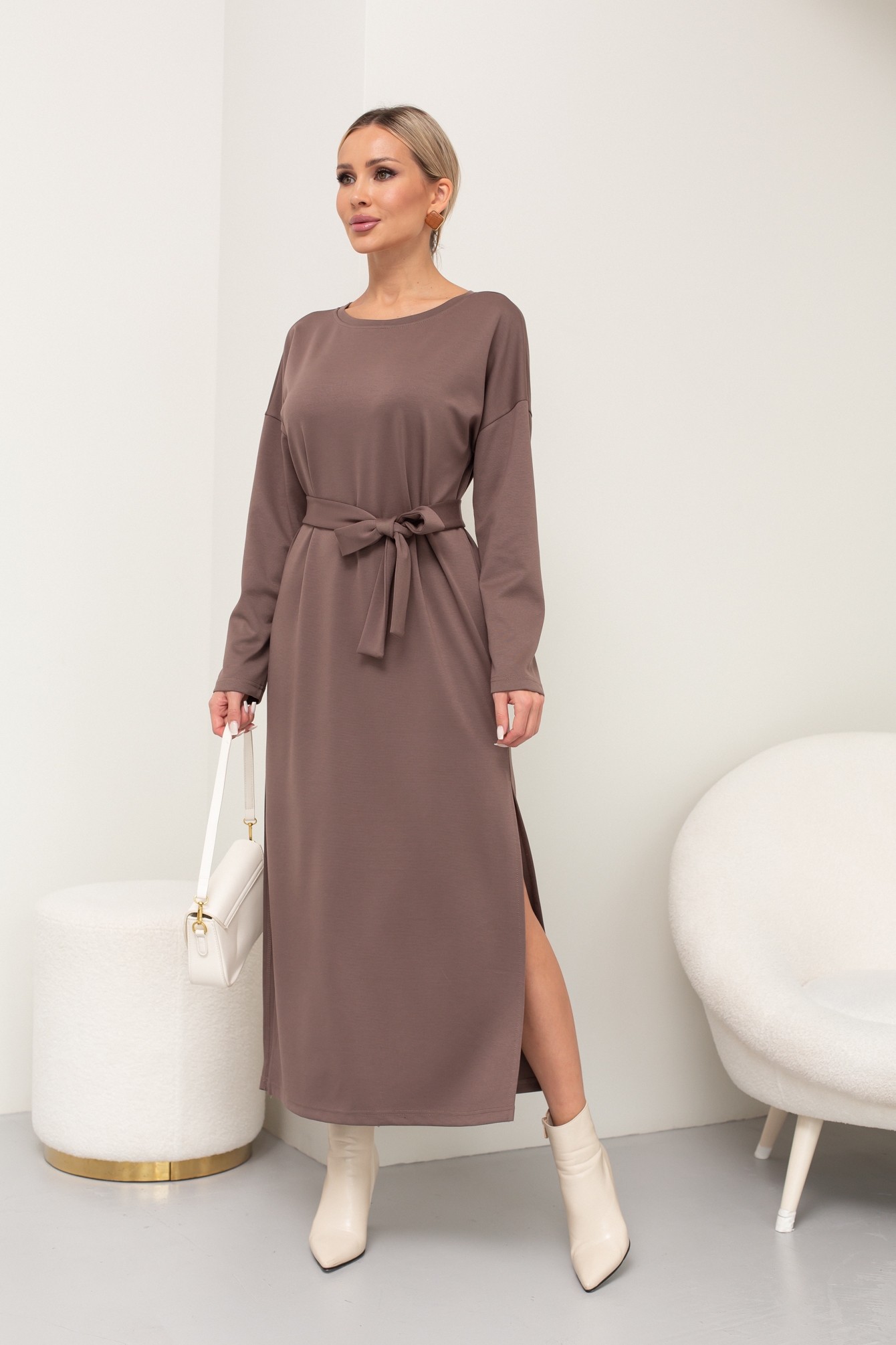 Удобное платье прямого кроя из однотонного трикотажного полотна. Длинный рукав со спущенным плечом. Округлая горловина на обтачке. Низ ровный, по бокам разрезы. Пояс из основной ткани в комплекте.