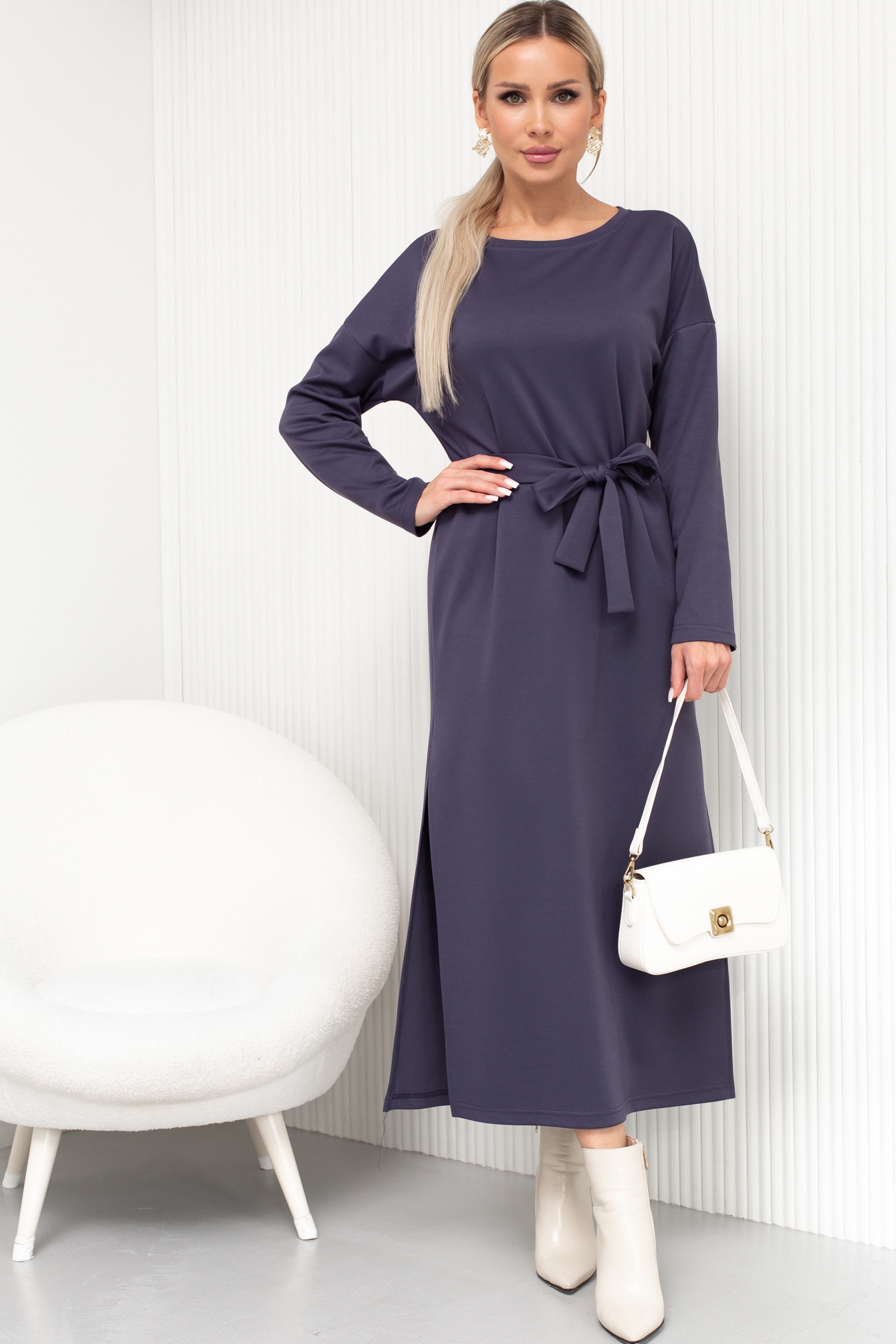 Удобное платье прямого кроя из однотонного трикотажного полотна. Длинный рукав со спущенным плечом. Округлая горловина на обтачке. Низ ровный, по бокам разрезы. Пояс из основной ткани в комплекте.