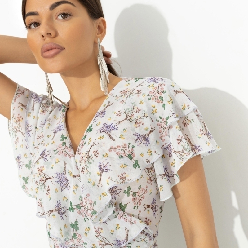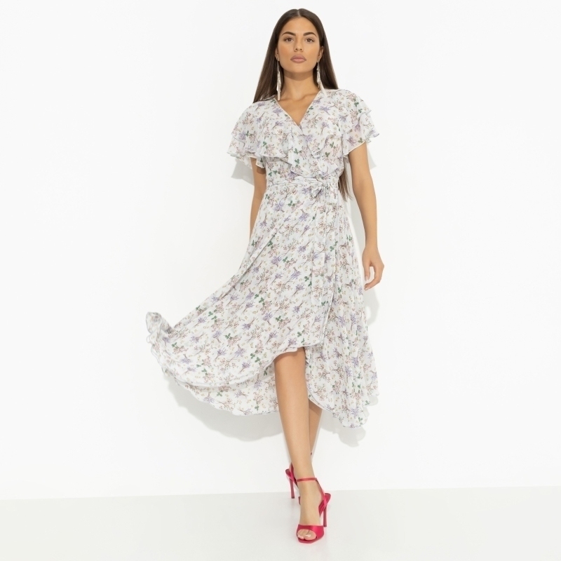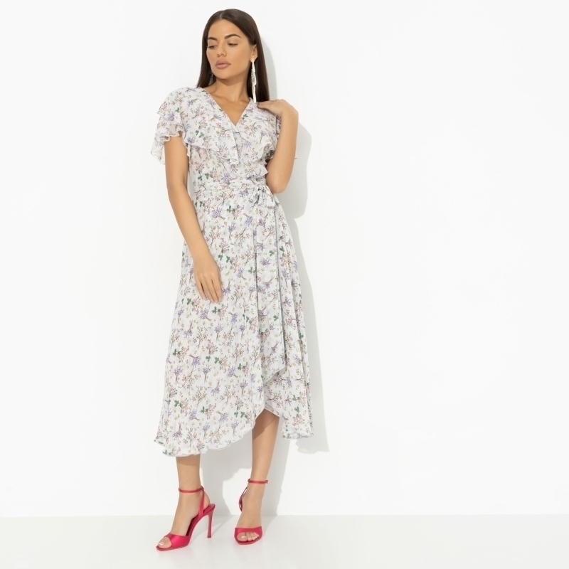 Вкус мятной конфетки не сравнится со свежестью, которую ты несешь своим появлением в платье CHARUTTI. Флористический принт добавляет твоей природной харизме дополнительные сто баллов. Платье приталенное в длине миди. Глубокий разрез за счет запаха. Есть тонкий пояс на линии талии. Рюши в зоне декольте и по спинке изделия.