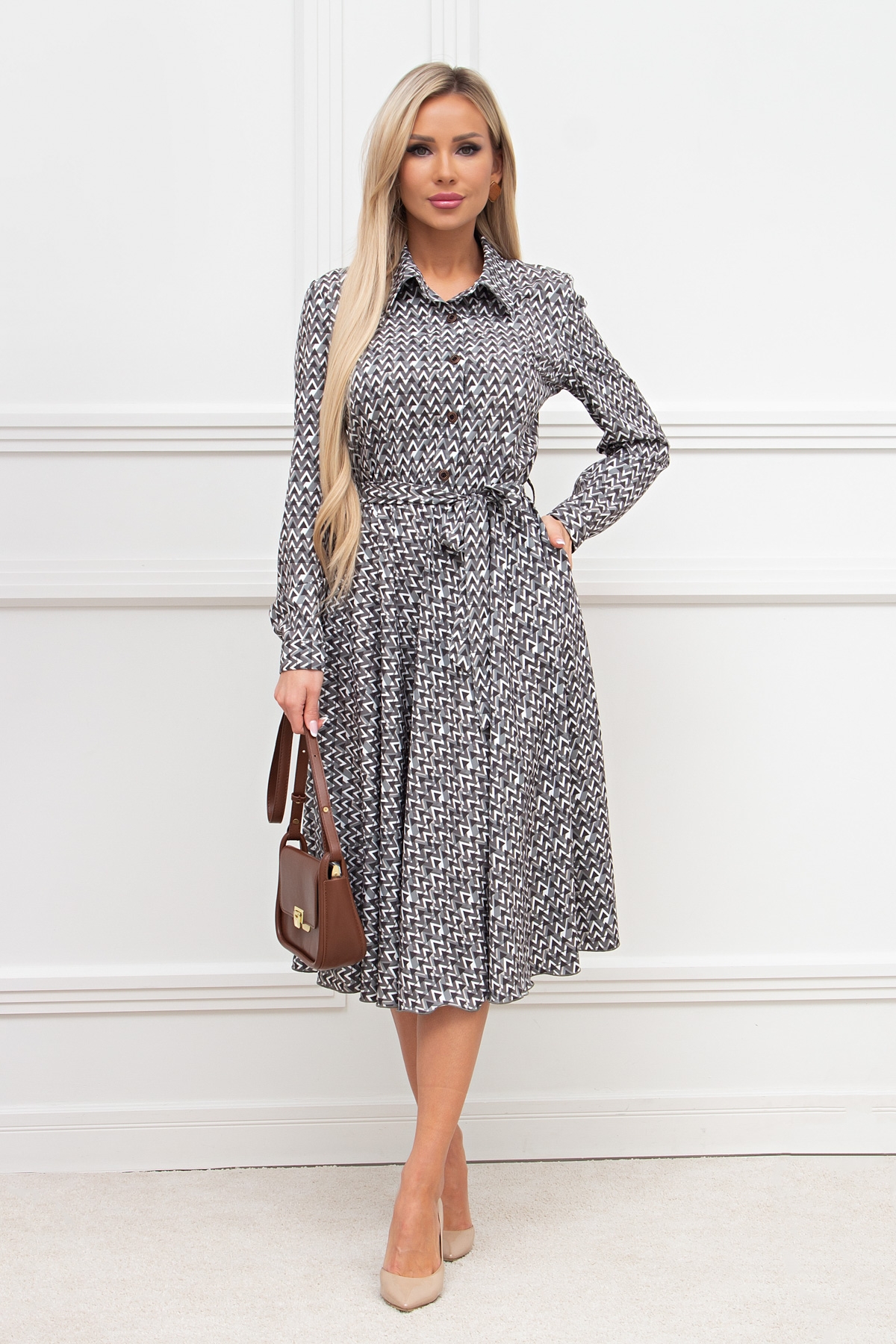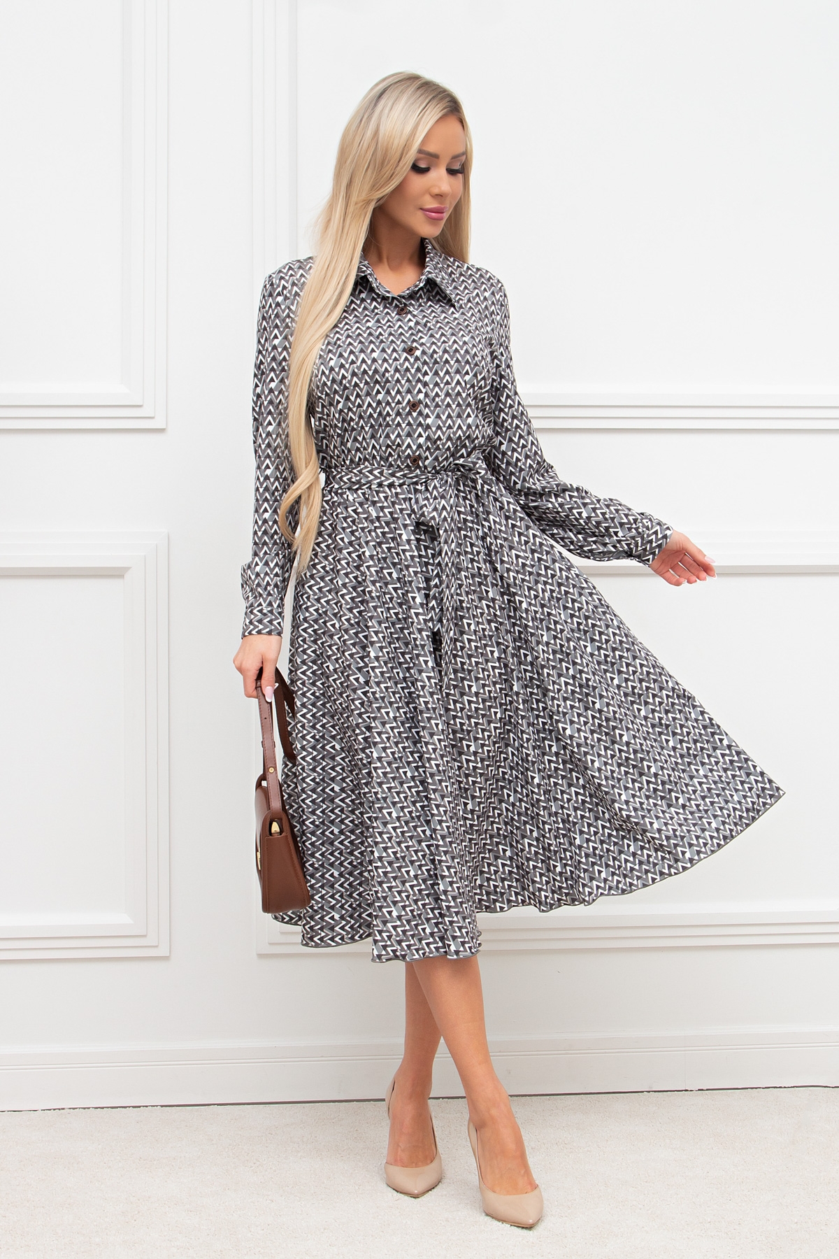 Красивое платье приталенного силуэта из легкой ткани - ниагара. Горловина оформлена отложным воротником на стойке. По переду выполнена планка с застежкой на петли и пуговицы. Длинный втачной рукав, оканчивается притачной манжетой. В боковых швах функциональные карманы. Модель отрезная по линии талии, присобрана на эластичную резинку. Тканевый пояс дополнительно акцентирует талию. Модель прекрасно дополнит ваш гардероб.