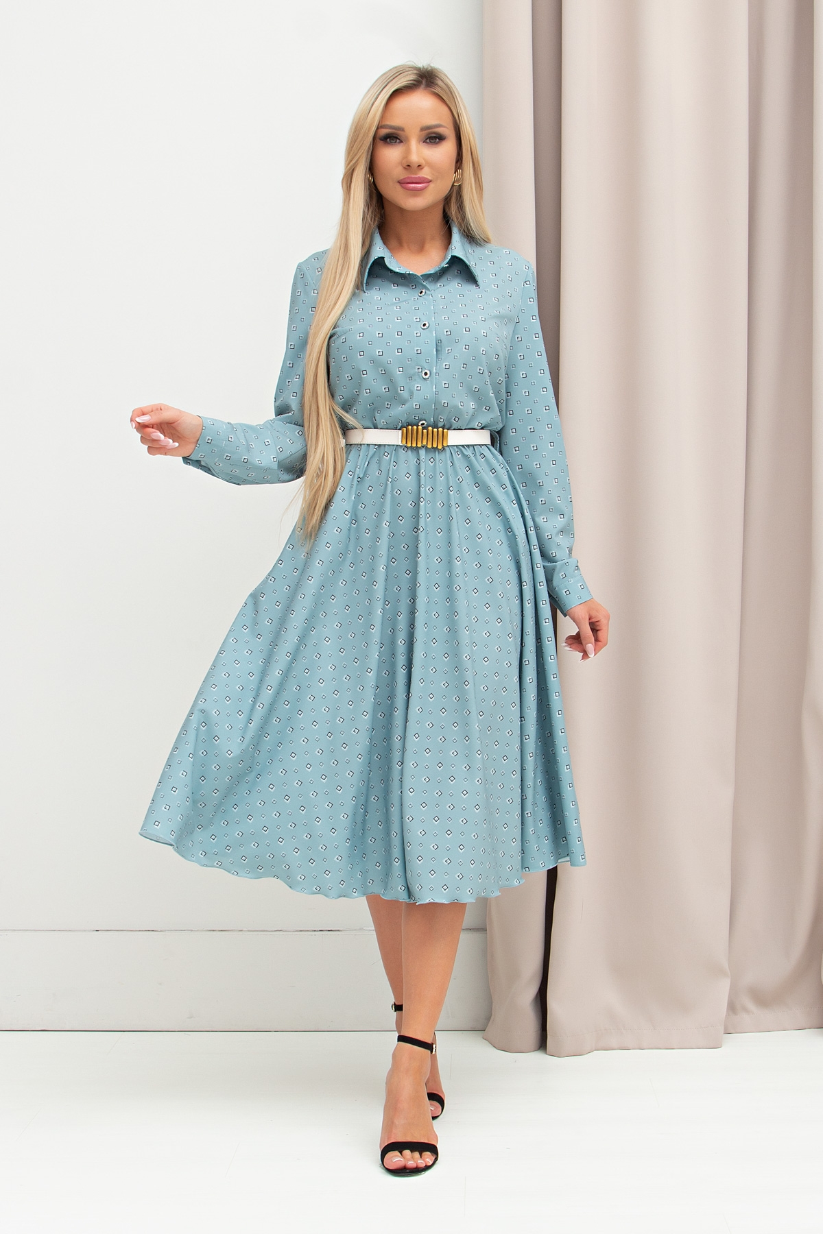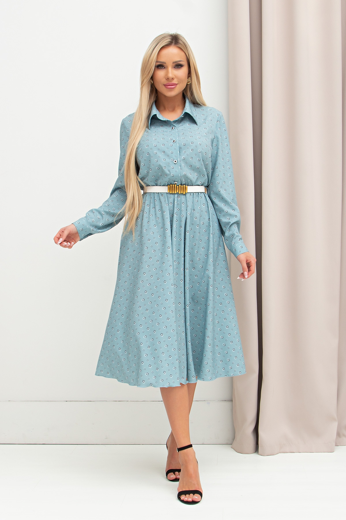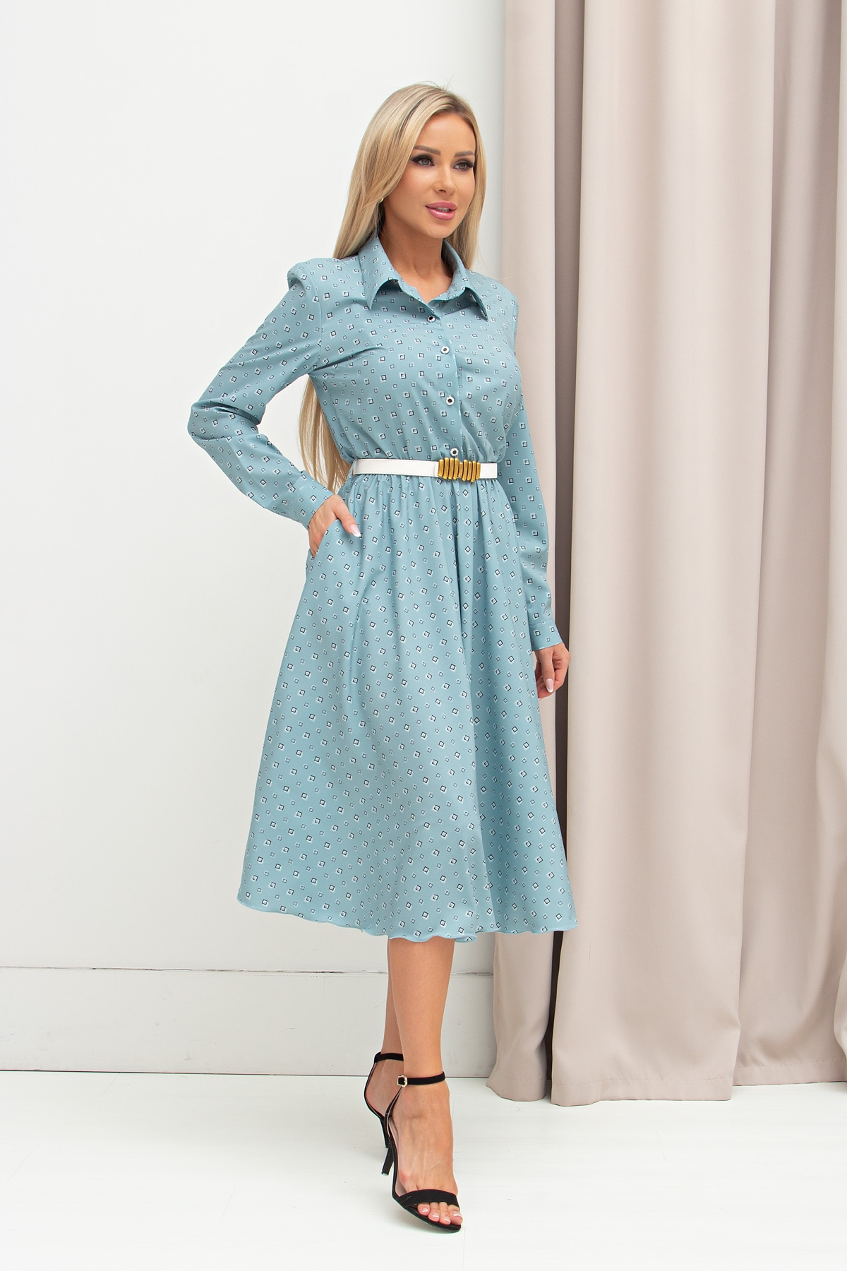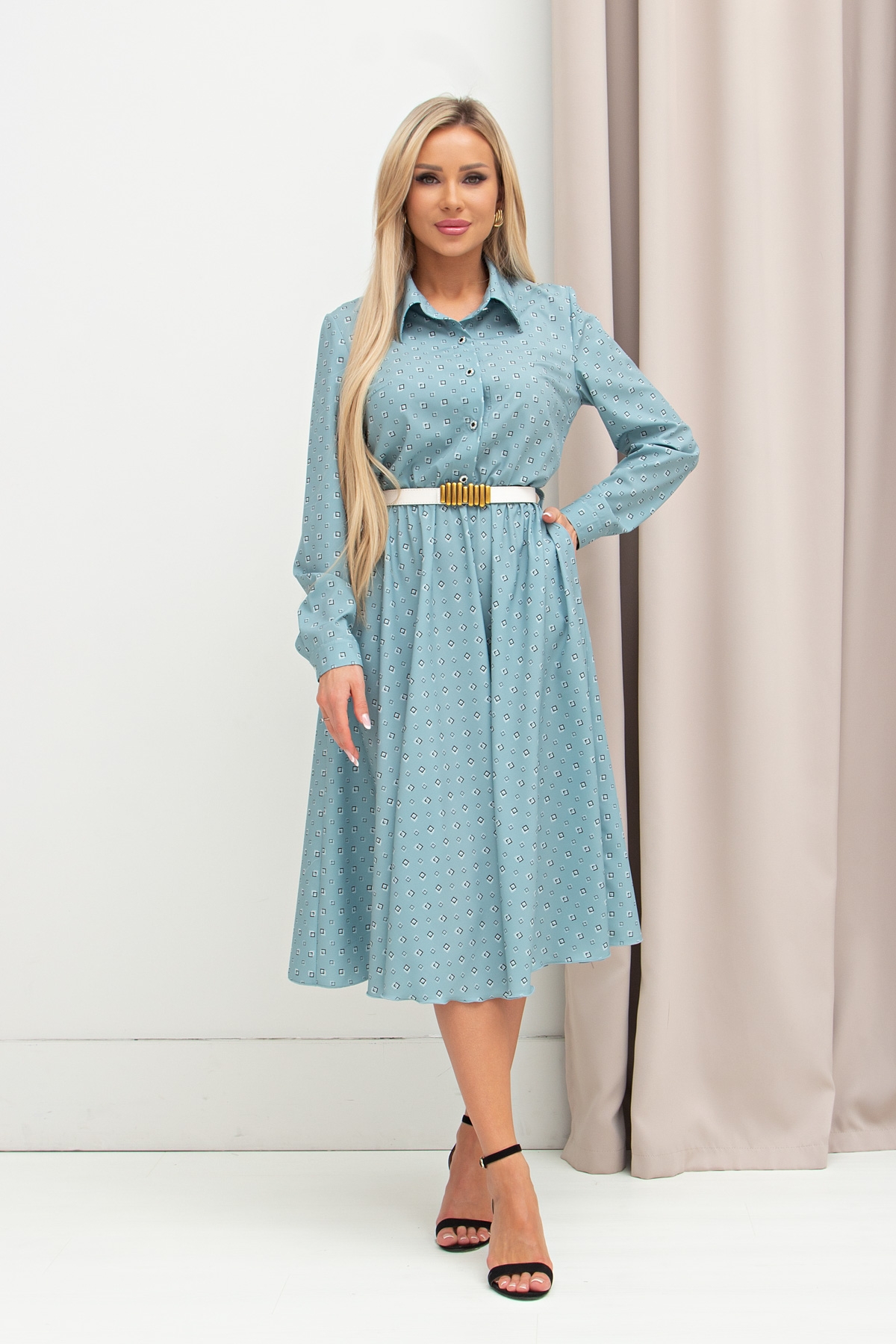 Красивое платье приталенного силуэта из легкой ткани - ниагара. Горловина оформлена отложным воротником на стойке. По переду выполнена планка с застежкой на петли и пуговицы. Длинный втачной рукав, оканчивается притачной манжетой. В боковых швах функциональные карманы. Модель отрезная по линии талии, присобрана на эластичную резинку. Тканевый пояс дополнительно акцентирует талию. Модель прекрасно дополнит ваш гардероб.