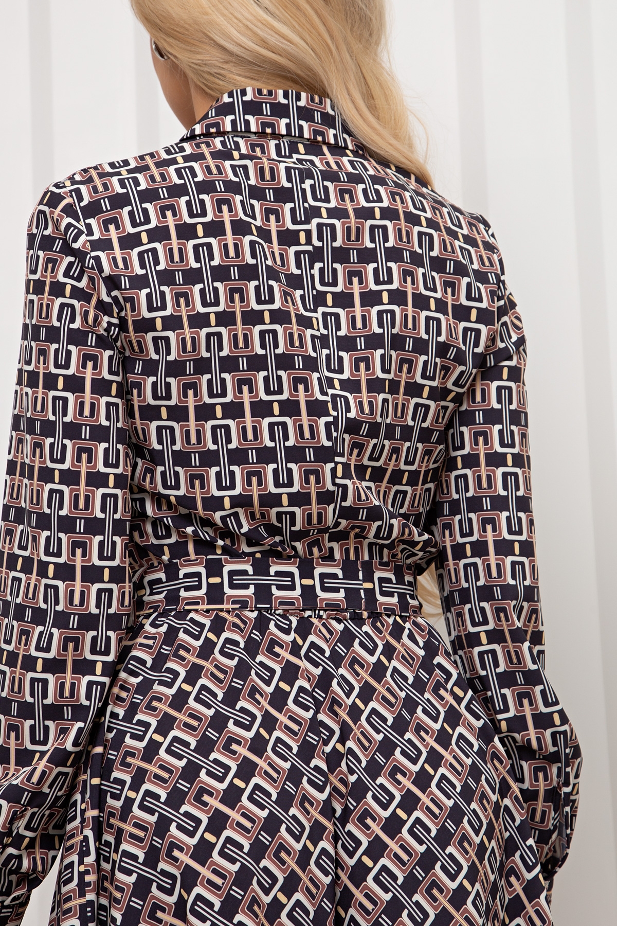 Красивое платье приталенного силуэта из легкой ткани - ниагара. Горловина оформлена отложным воротником на стойке. По переду выполнена планка с застежкой на петли и пуговицы. Длинный втачной рукав, оканчивается притачной манжетой. В боковых швах функциональные карманы. Модель отрезная по линии талии, присобрана на эластичную резинку. Тканевый пояс дополнительно акцентирует талию. Модель прекрасно дополнит ваш гардероб.