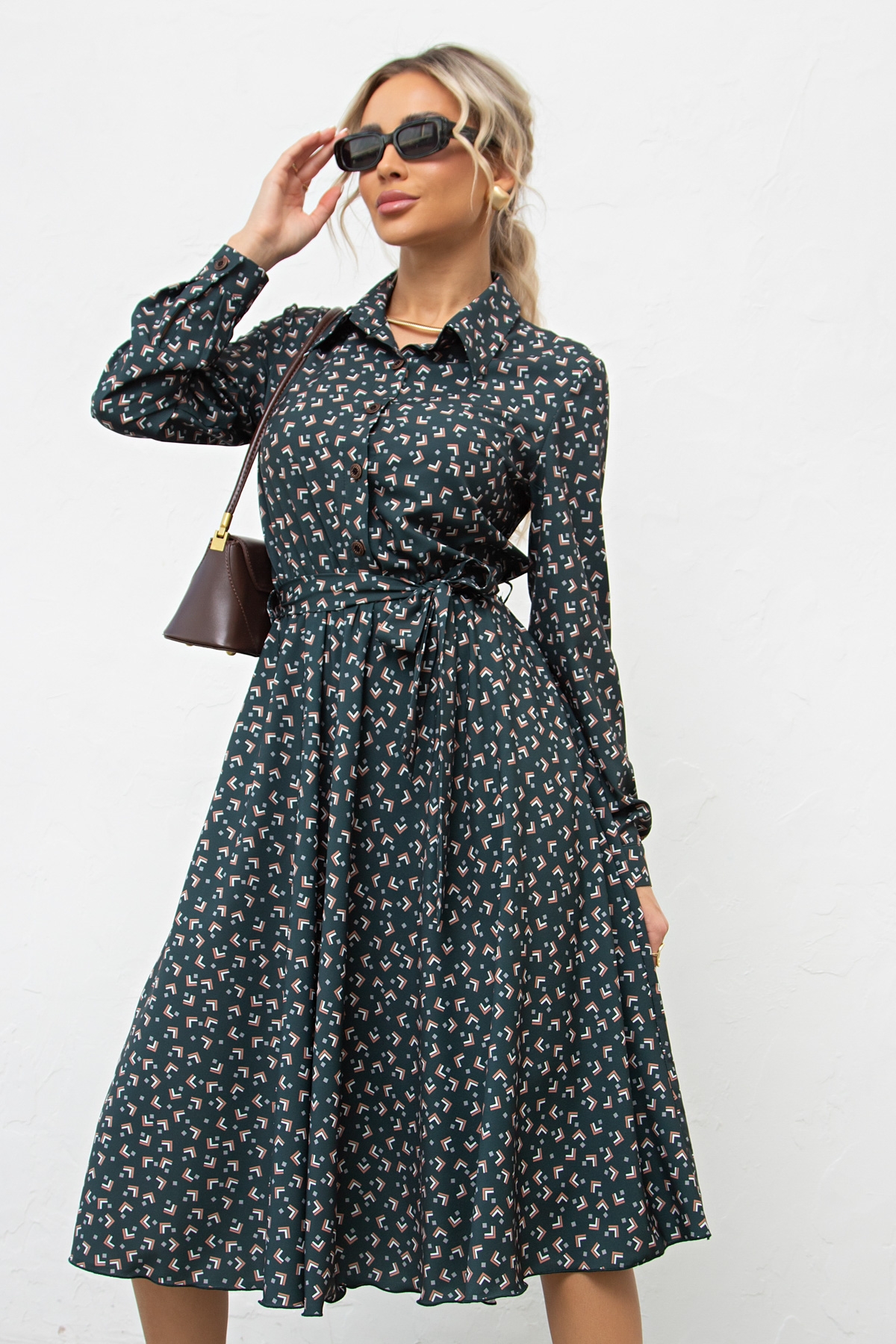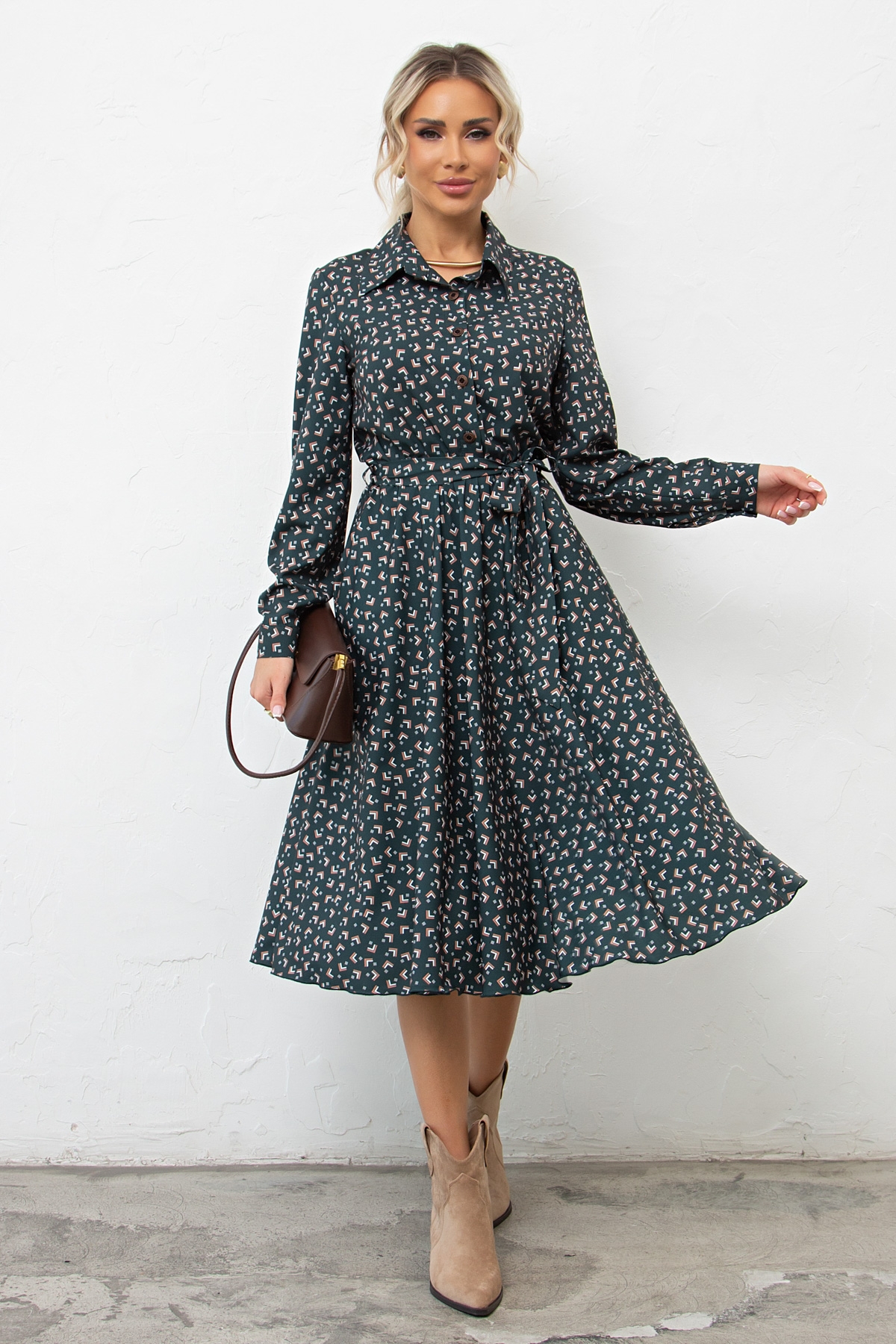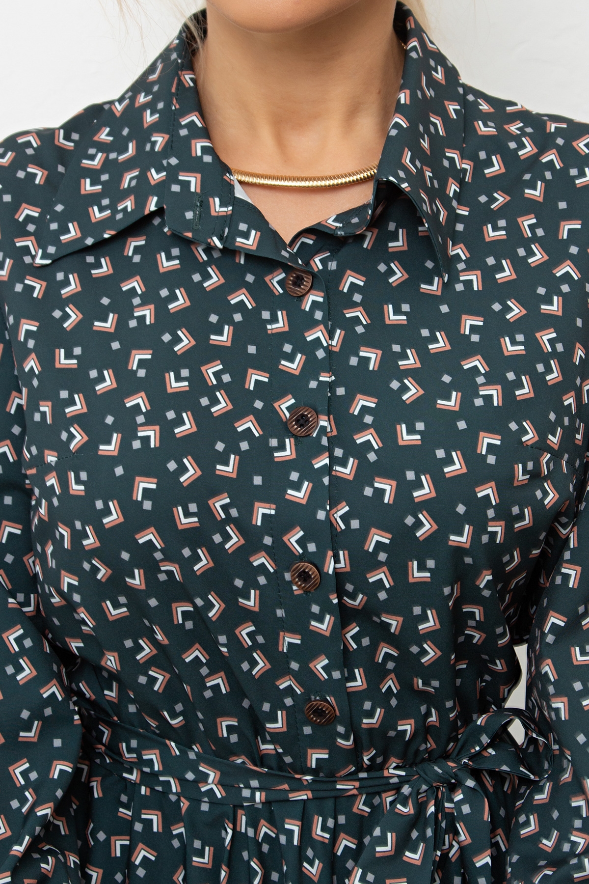 Красивое платье приталенного силуэта из легкой ткани - ниагара. Горловина оформлена отложным воротником на стойке. По переду выполнена планка с застежкой на петли и пуговицы. Длинный втачной рукав, оканчивается притачной манжетой. В боковых швах функциональные карманы. Модель отрезная по линии талии, присобрана на эластичную резинку. Тканевый пояс дополнительно акцентирует талию. Модель прекрасно дополнит ваш гардероб.
