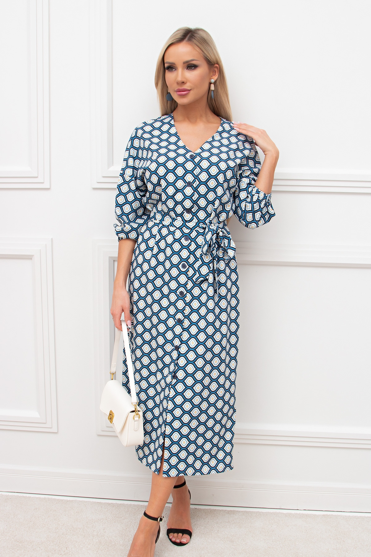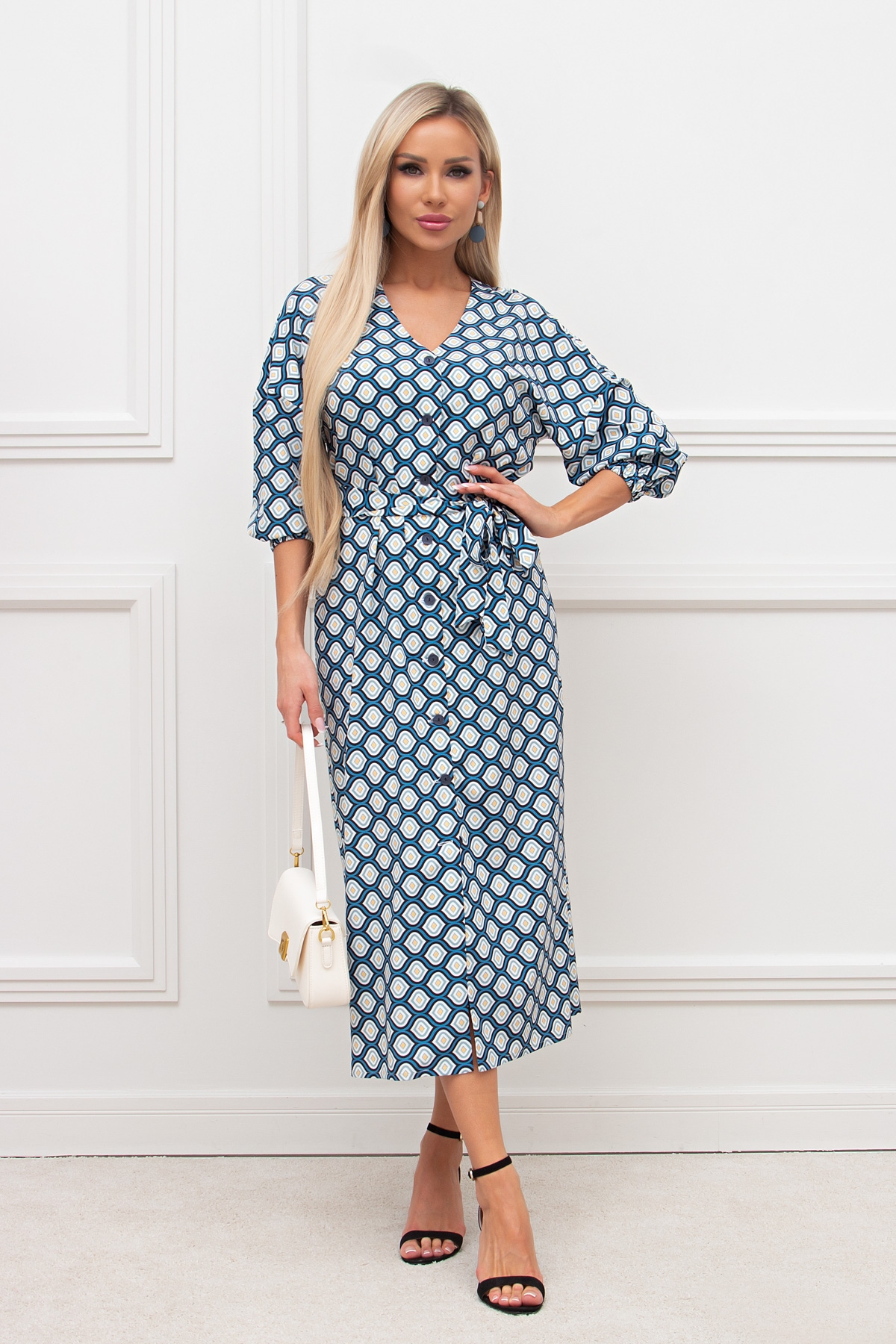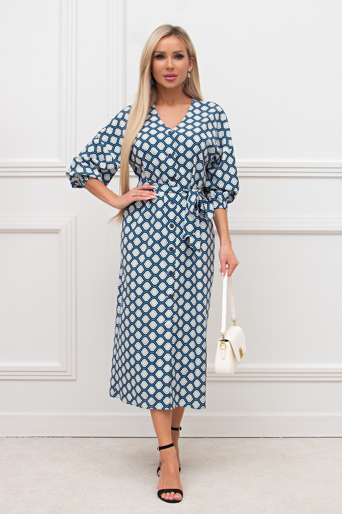 Женственное платье прямого силуэта. V - образная горловина на внутренней обтачке. По переду застежка на петли и пуговицы. Втачной рукав со спущенным плечом длинной 3/4 присборен на резинку. Низ ровный, без разрезов. Пояс из основного материала в комплекте.