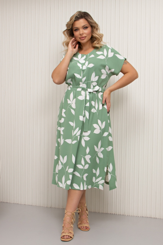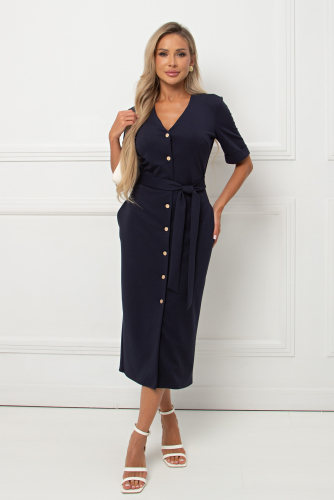 Универсальное платье прямого силуэта из трикотажного полотна. Цельнокроеный короткий рукав. Горловина оформлена лодочкой. Тканевый пояс подчеркнет линию талии. Низ ровный, сбоку разрез.
