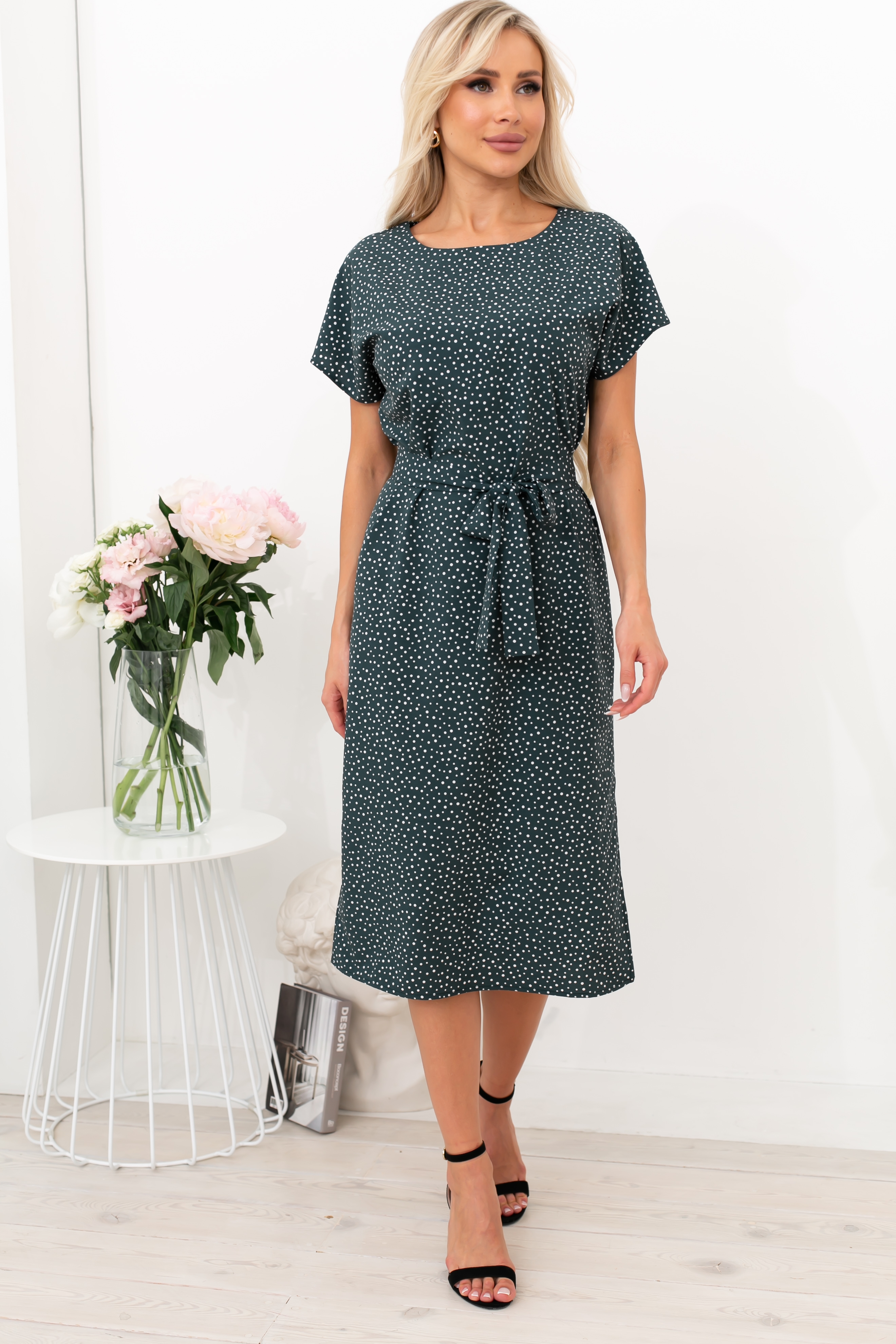 Универсальное платье прямого силуэта. Цельнокроеный короткий рукав. Горловина оформлена лодочкой. Тканевый пояс подчеркнет линию талии. Низ ровный, сбоку разрез.