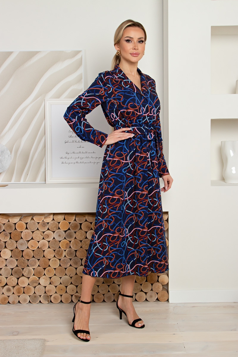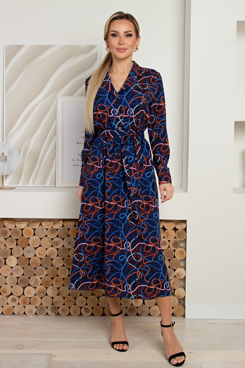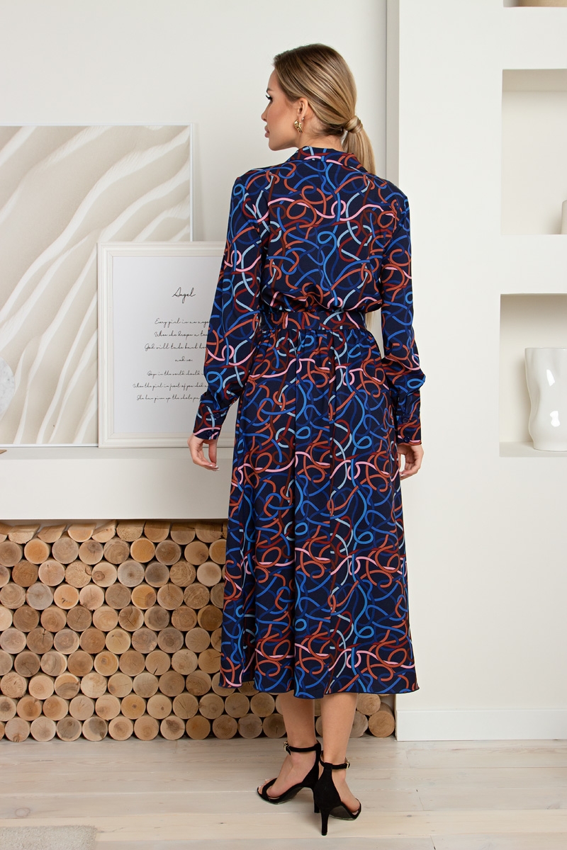 Красивое платье полуприлегающего силуэта. Втачные длинные рукава оканчиваются притачной манжетой. Горловина оформлена английским отложным воротником. По переду выполнена планка с застежкой на пуговицы. Платье отрезное по линии талии, присобрана на эластичную резинку. Низ ровный, без разрезов. Модель подойдет для прогулок и приятных встреч с друзьями.