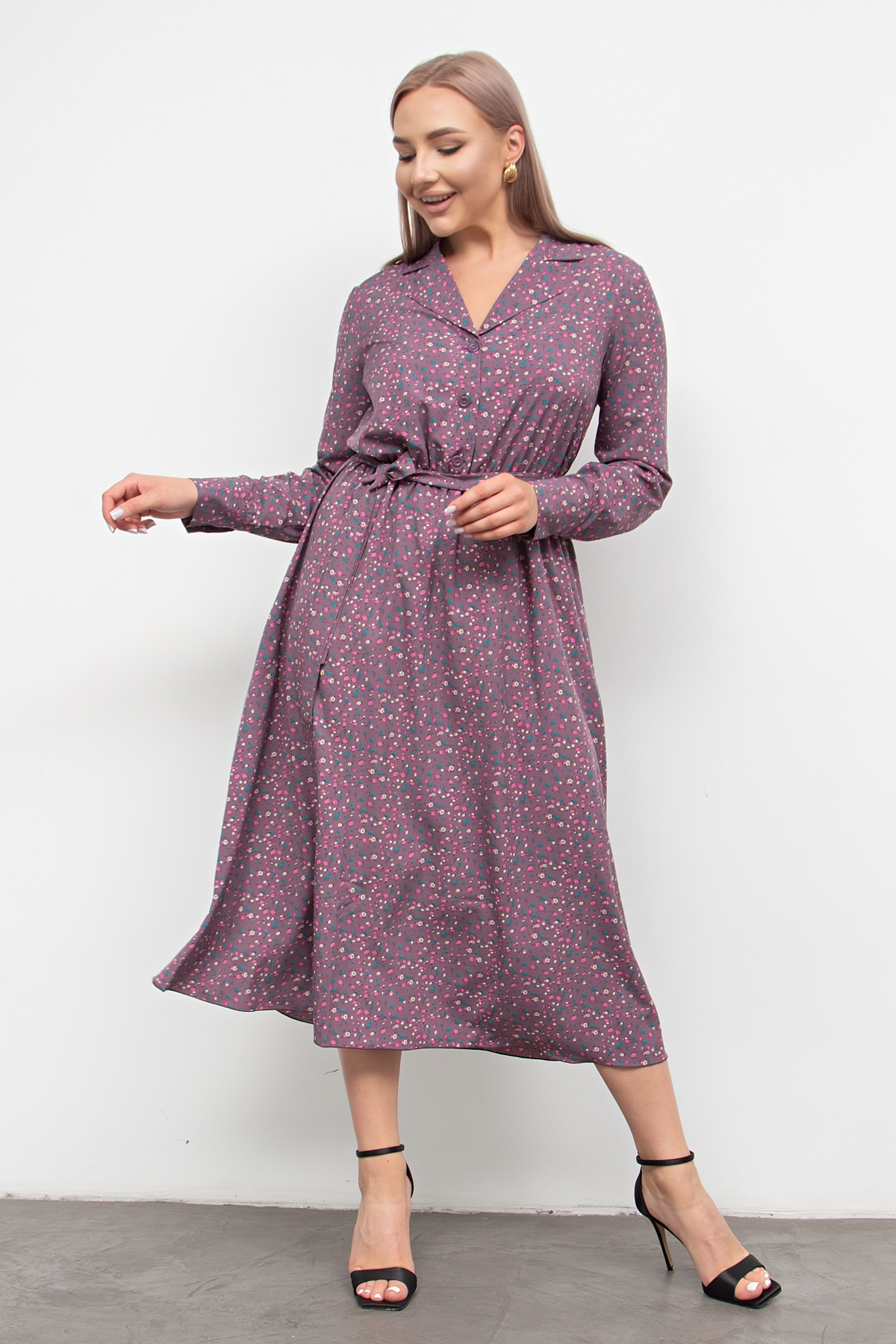 Красивое платье полуприлегающего силуэта. Втачные длинные рукава оканчиваются притачной манжетой. Горловина оформлена английским отложным воротником. По переду выполнена планка с застежкой на пуговицы. Платье отрезное по линии талии, присобрана на эластичную резинку. Пояс из основного материала входит в комплект. Низ ровный, без разрезов.