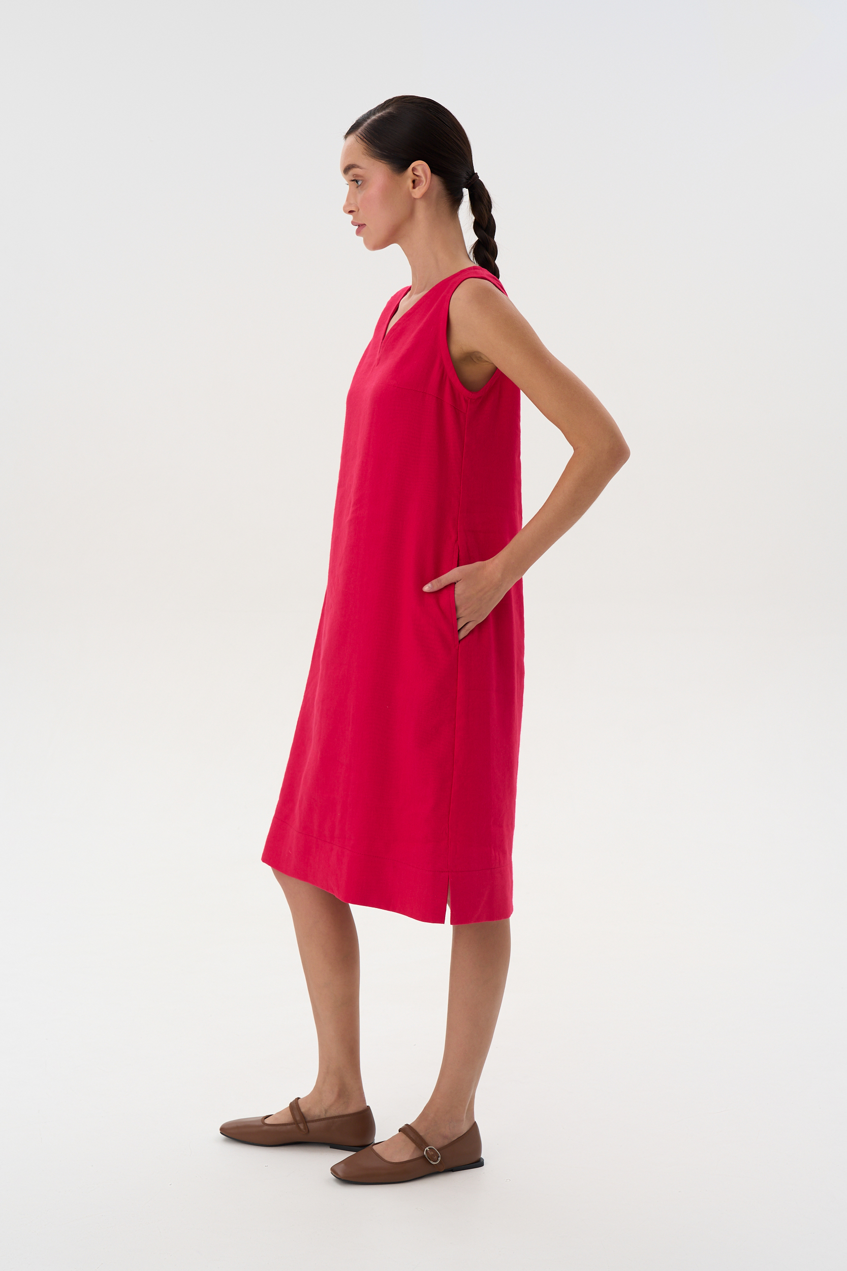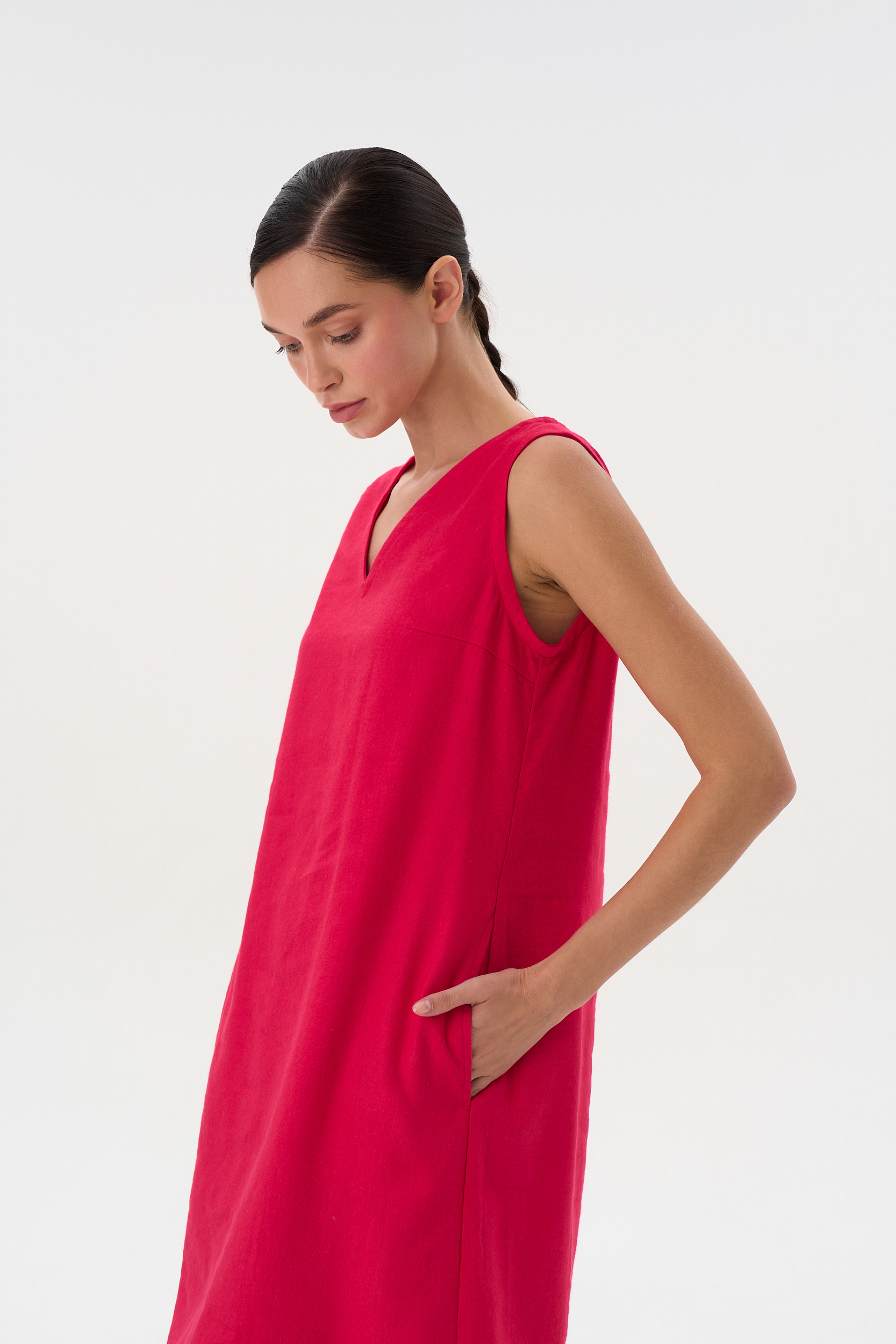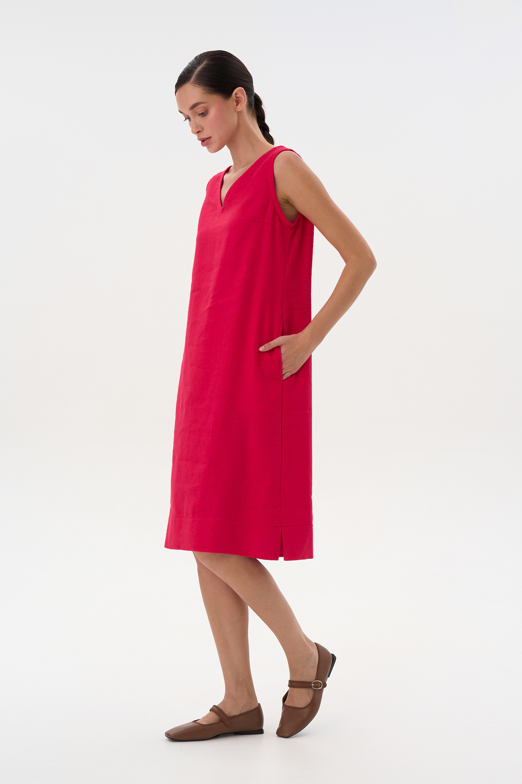 Платье расклешенное без рукавов длиной до середины колена. Горловина V-образная В боках карманы и небольшие разрезы.