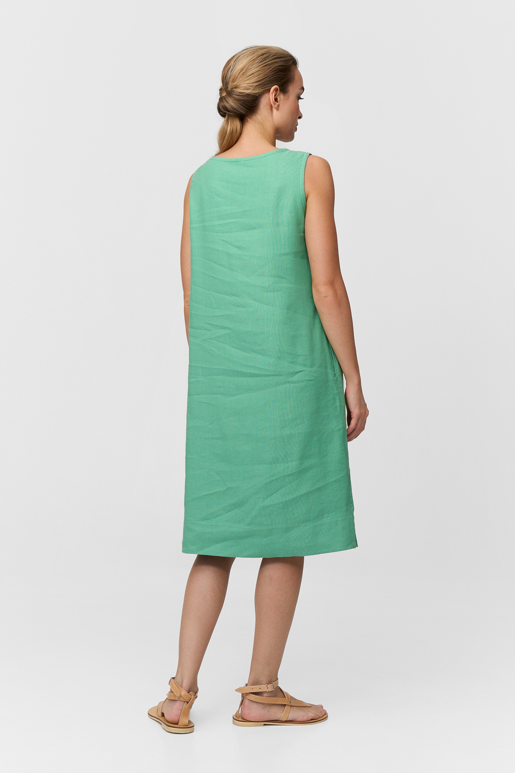 Платье расклешенное без рукавов длиной до середины колена. Горловина V-образная В боках карманы и небольшие разрезы.