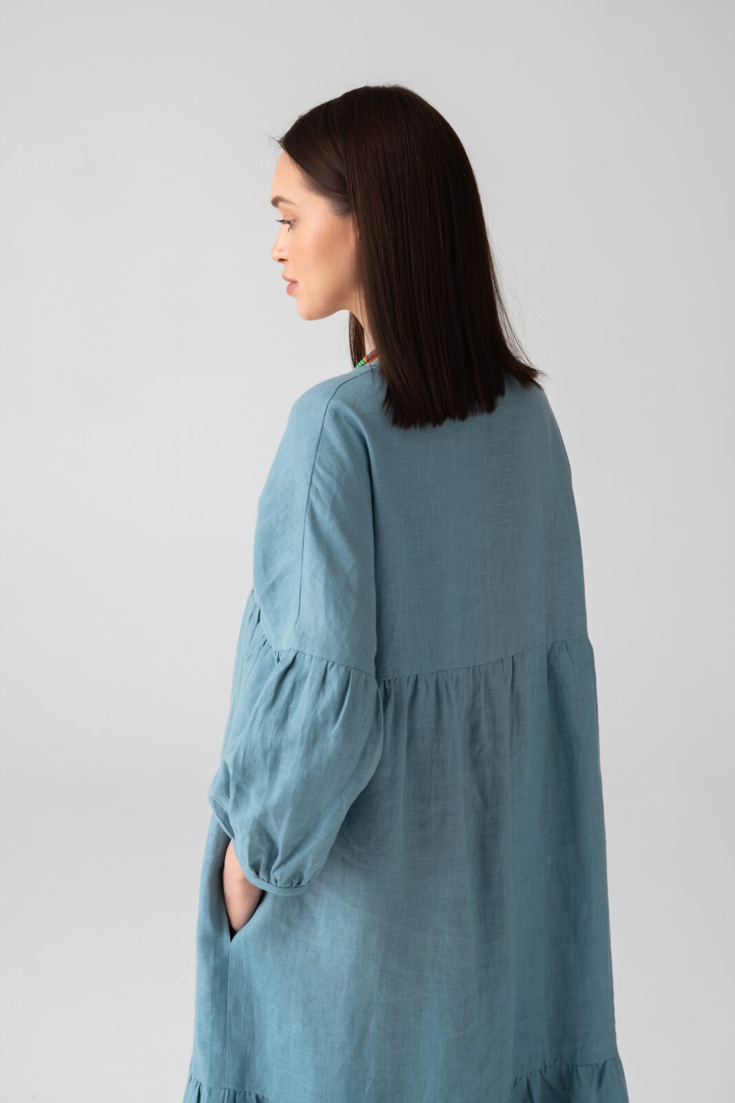 Платье ярусное свободное отрезное под грудью. Рукав цельнокроеный с отрезной частью на сборке. Горловина V-образной формы. Карманы в боковых швах.