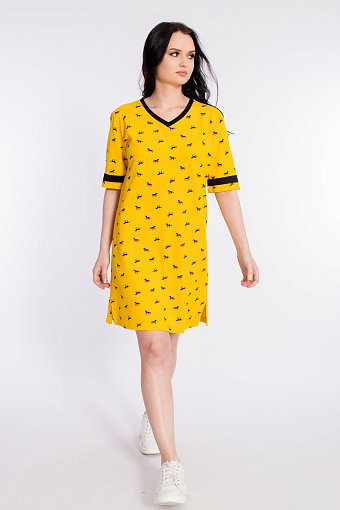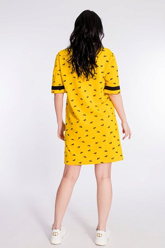 Платье спортивного стиля из полотна пике с набивным рисунком. Платье со спущенным рукавом длиной до локтя. Горловина V-образная, с планкой. Лампасы на рукавах и планка по горловине из отделочного полотна. Внизу боковых швов разрезы.