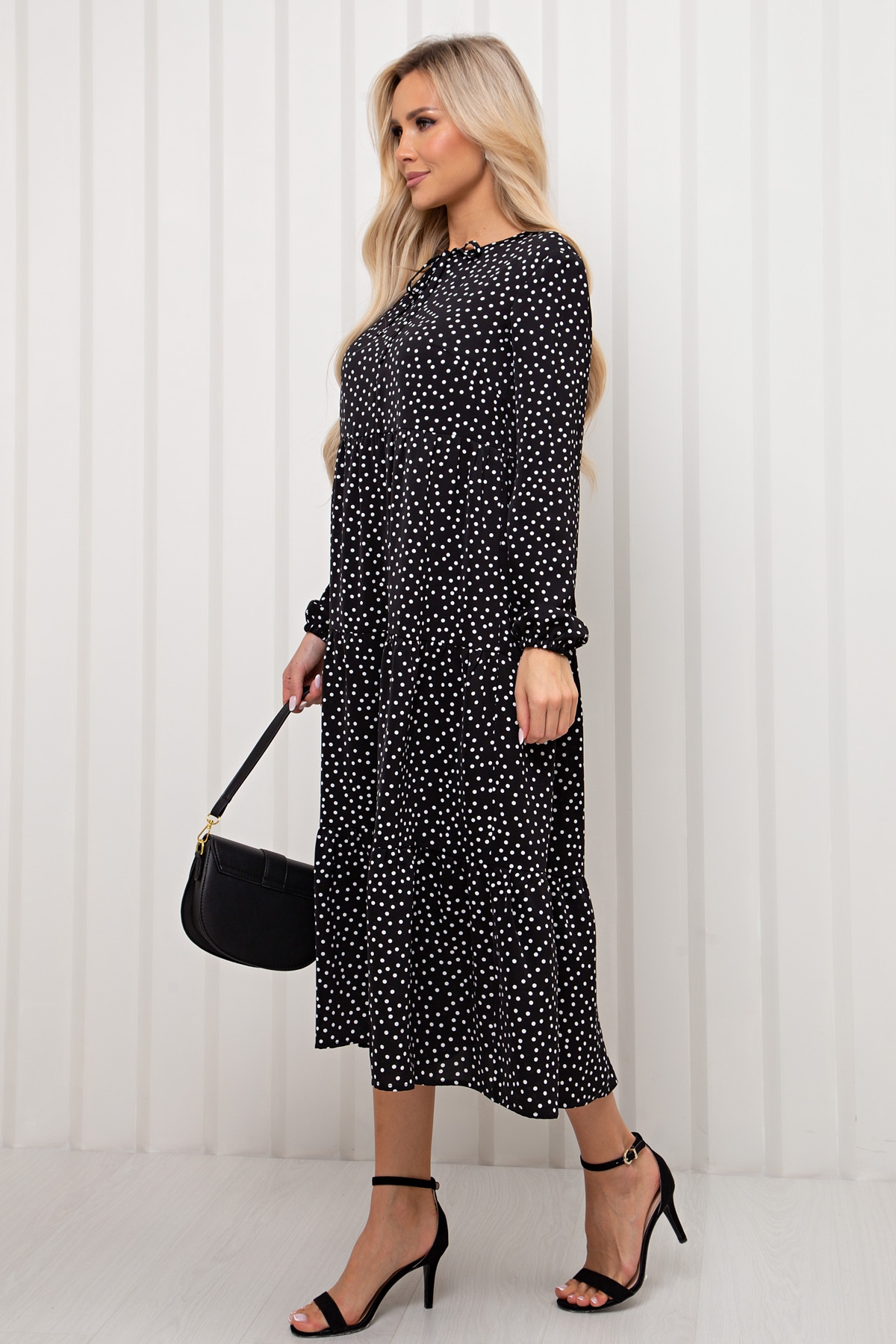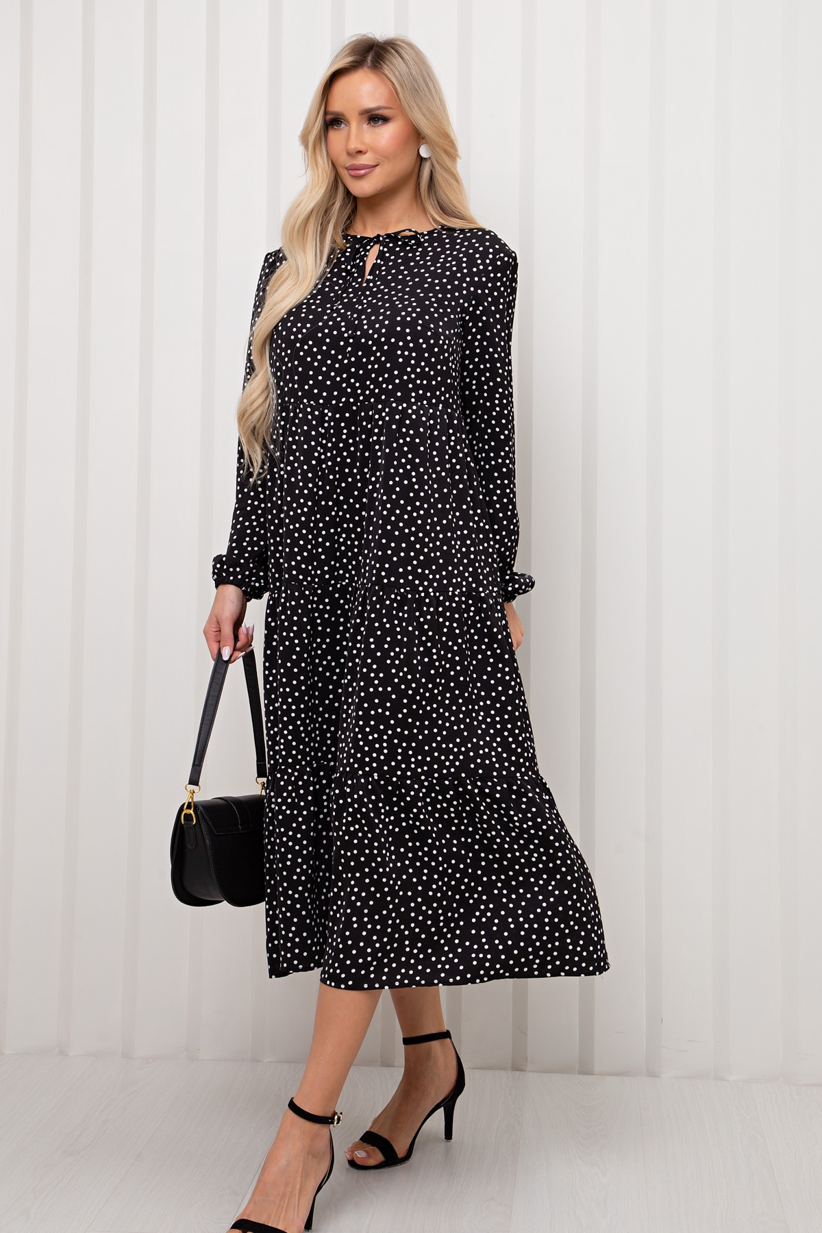Красивое платье из легкой ткани - Ниагара. Модель отрезная по линии талии. Юбка состоит из трех ярусов на сборке. Округлая горловина отделана узкой бейкой переходящей в завязки, по переду разрез - капелька. Рукав втачной длинный, низ на резинке. Низ ровный, без разрезов. Легкое и воздушное платье подойдет для прогулок и приятных встреч.