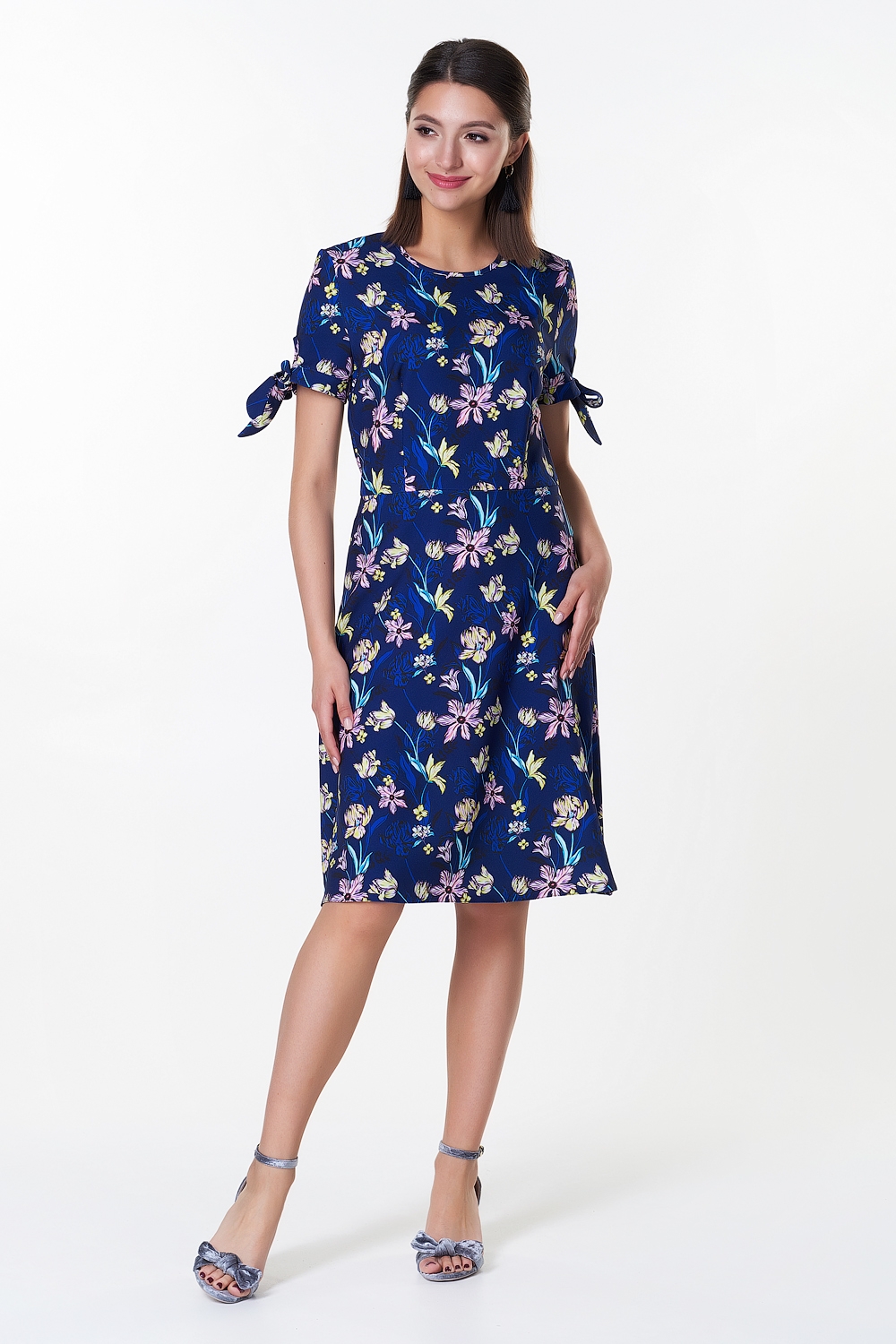 Удобное платье приталенного силуэта из ткани с цветочным принтом. Короткие втачные рукава оканчиваются манжетами с завязками. Вырез горловины округлый. В среднем шве спинки расположена застежка на потайную молнию. Низ ровный, без разреза.