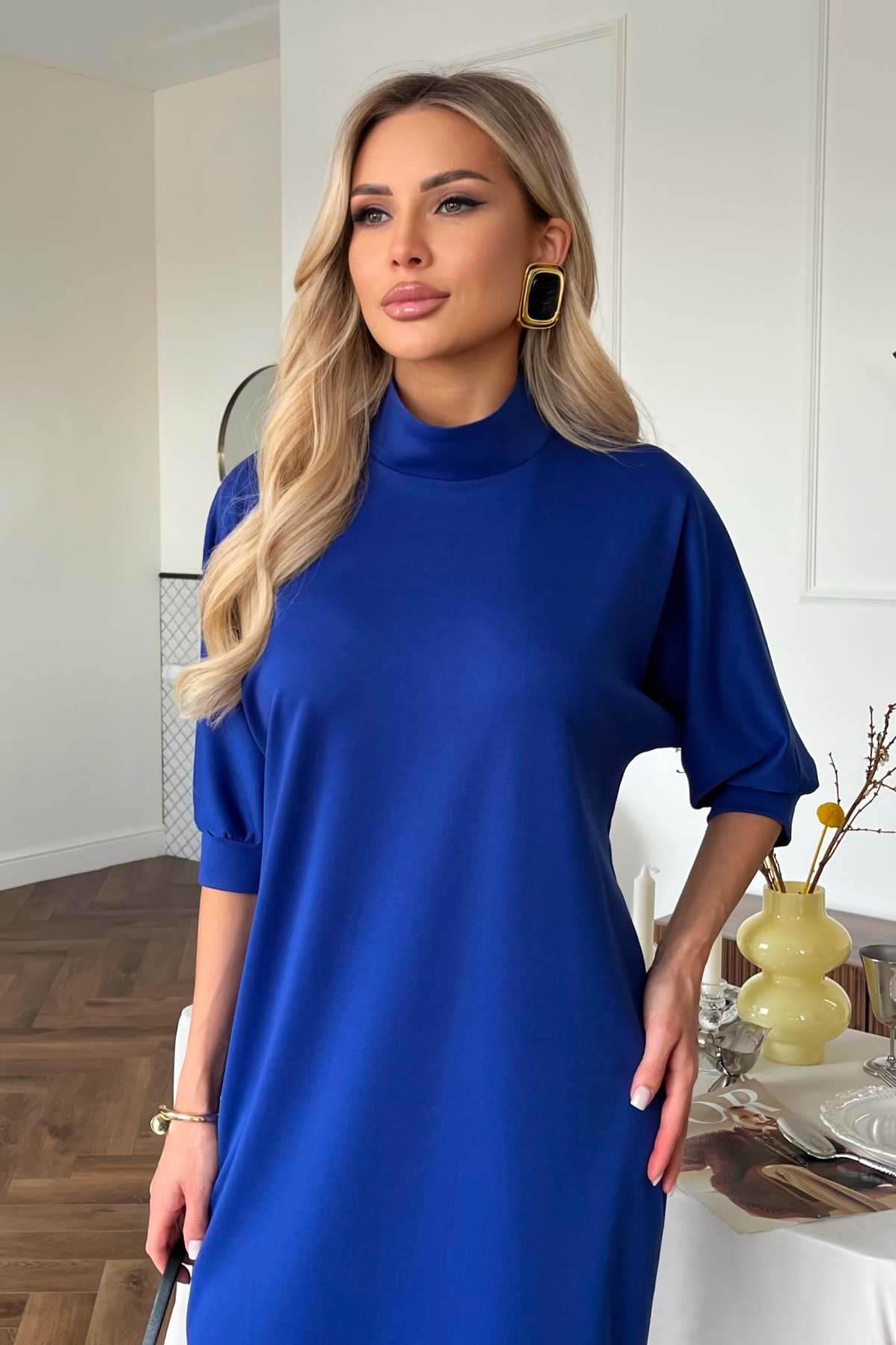 Элегантное платье свободного кроя выполнено из однотонного трикотажного полотна. Короткий рукав - летучая мышь присобрана на манжету. Горловина оформлена воротником - стойка. По среднему шву спинки застежка на потайную ленту - молнию. Низ ровный, без разрезов.
