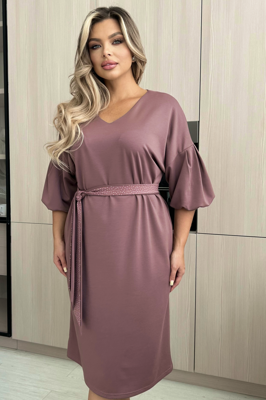 Элегантное платье прямого силуэта изготовлено из трикотажного полотна. V-образная горловина на внутренней обтачке. Втачной рукав фонарик со спущенным плечом. Низ ровный, без разрезов. Модель дополняет пояс с отделкой.