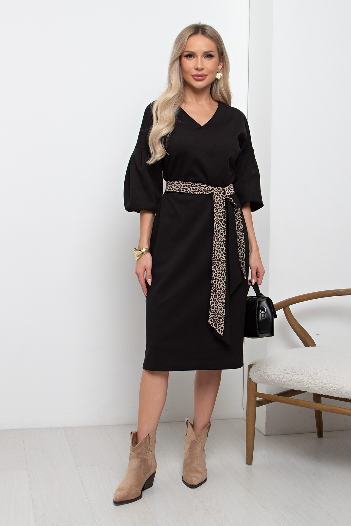 Элегантное платье прямого силуэта изготовлено из трикотажного полотна. V-образная горловина на внутренней обтачке. Втачной рукав фонарик со спущенным плечом. Низ ровный, без разрезов. Модель дополняет пояс с отделкой.