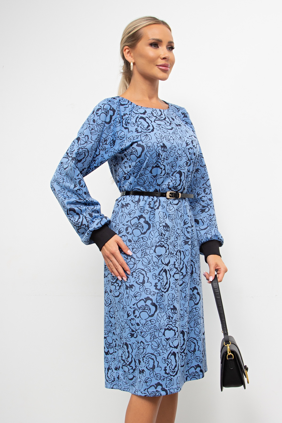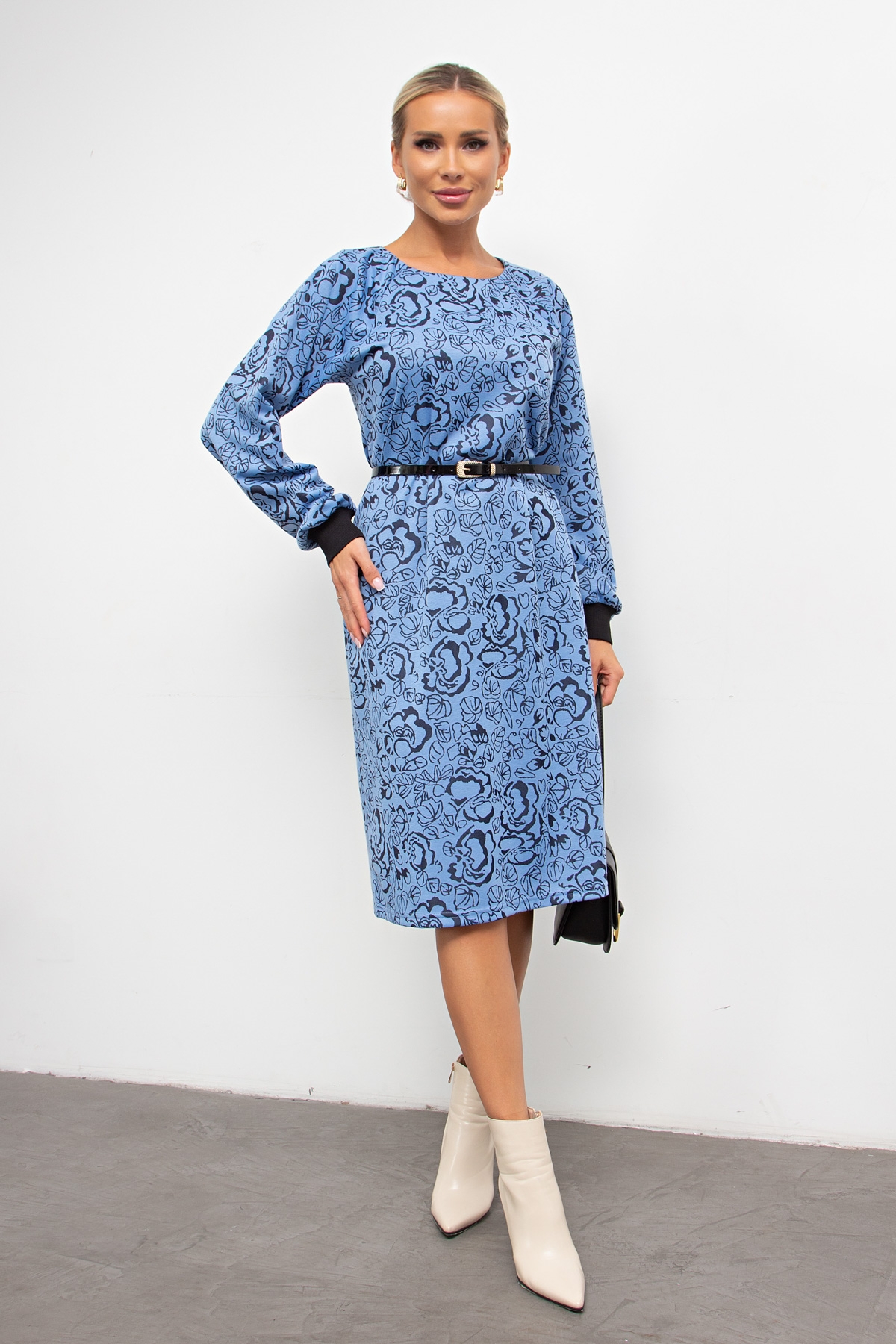 Платье прямого силуэта из трикотажного полотна. Округлая горловина на внутренней обтачке. Длинный рукав реглан, оканчивается притачной манжетой. По спинке застежка на потайную молнию. Низ ровный, без разрезов. Ремень входит в комплект.