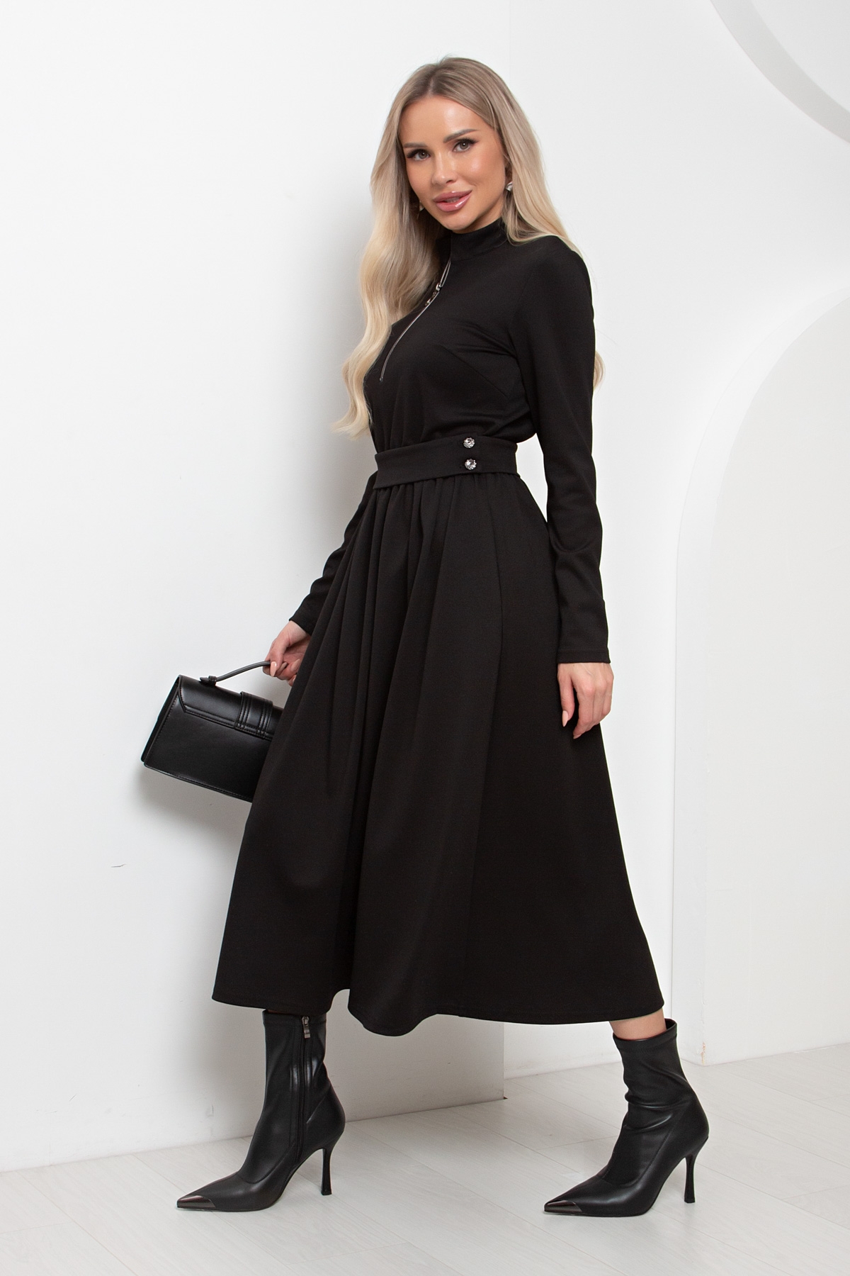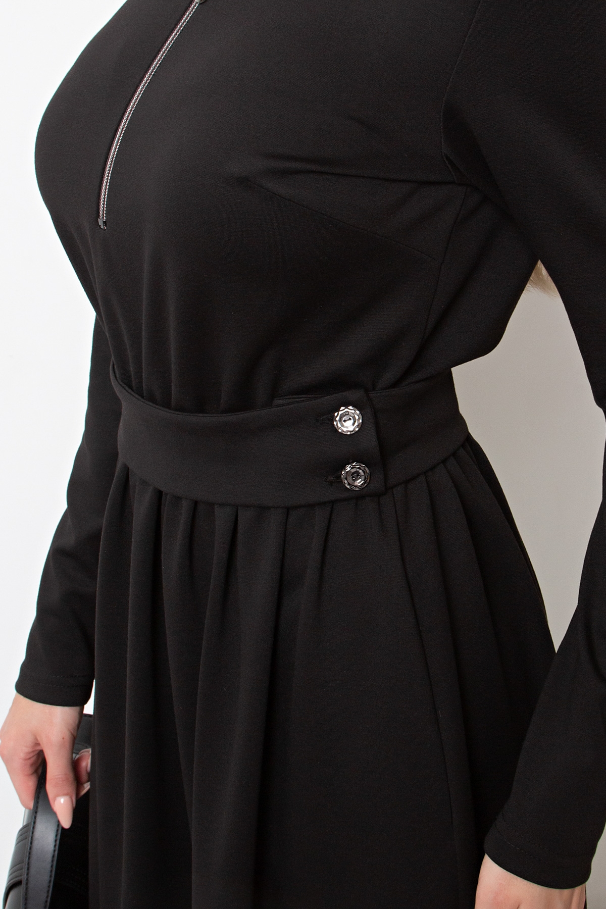 Элегантное платье приталенного силуэта из трикотажного полотна. Горловина оформлена воротником- стойкой с застежкой на молнию. Длинный втачной рукав. Модель отрезная по линии талии, присборена на эластичную резинку. В боковых швах функциональные карманы.  Пояс с застежкой на петли и пуговицы. Низ ровный, без разрезов.