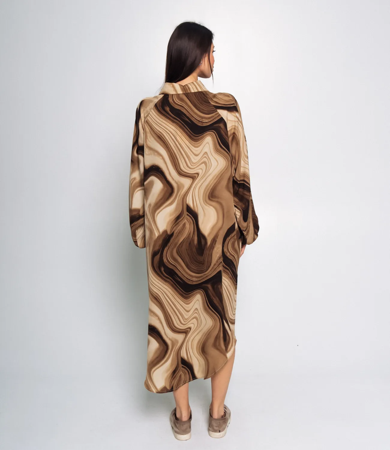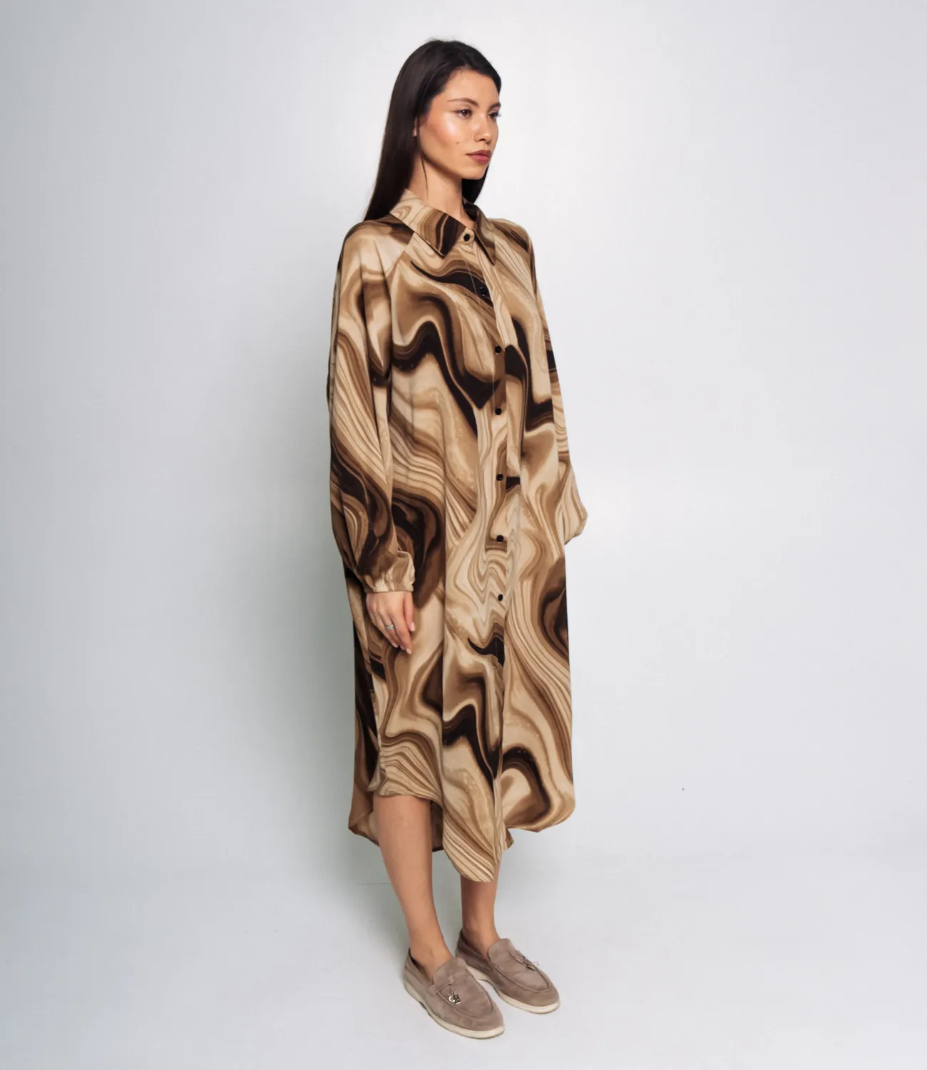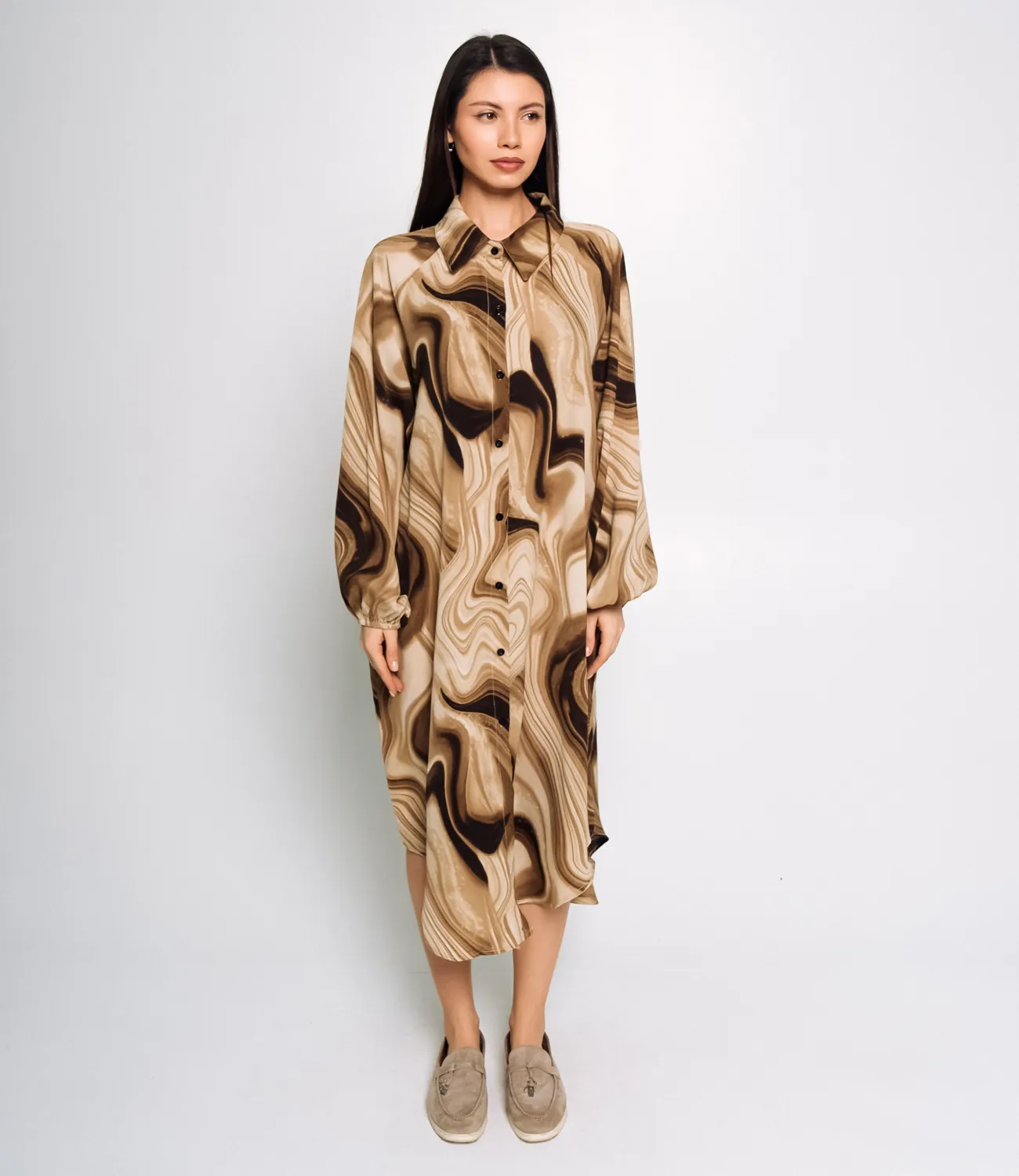 Это платье-рубашка — прекрасный выбор для вашего магазина, предлагая стильный и универсальный дизайн, который станет отличным дополнением к гардеробу ваших клиентов. Стильное платье-рубашка с длинным рукавом, идеально подходит для создания как повседневных, так и деловых образов. Нежные нейтральные тона с абстрактным узором, что делает его универсальным для различных стилей. Свободный и расслабленный крой, расходящийся к низу, что позволяет легко передвигаться и чувствовать себя комфортно. Разрезы по бокам для удобства и стильный акцент; подходит как для носки с каблуками, так и для кроссовок. Изготовлено из ткани 100% полиэстер платье обеспечивает отличное качество и приятные тактильные ощущения. Независимо от сезона, она станет любимым элементом в гардеробе ваших клиентов. На странице сайта доступна таблица размеров, что позволит вашим покупателям легко найти подходящий вариант. Установленная цена делает это платье доступным для широкой аудитории, что обеспечит вам высокий уровень продаж. Рост 164 см, 83-61-89.