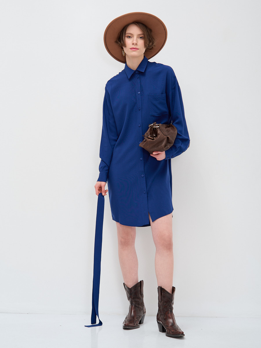 Платье-рубашка оверсайз из однотонного штапеля со спущенной линией плеча. Рукав втачной, длинный на манжете. Накладной нагрудный карман. Карманы в боковых швах. Фигурный низ изделия. Застежка на пуговицы. Съёмный пояс из основной ткани. Рост модели 175 см. Изделие на модели 42 р-ра. Длина изделия по спинке 94 см. Машинная деликатная стирка при 30 градусах.