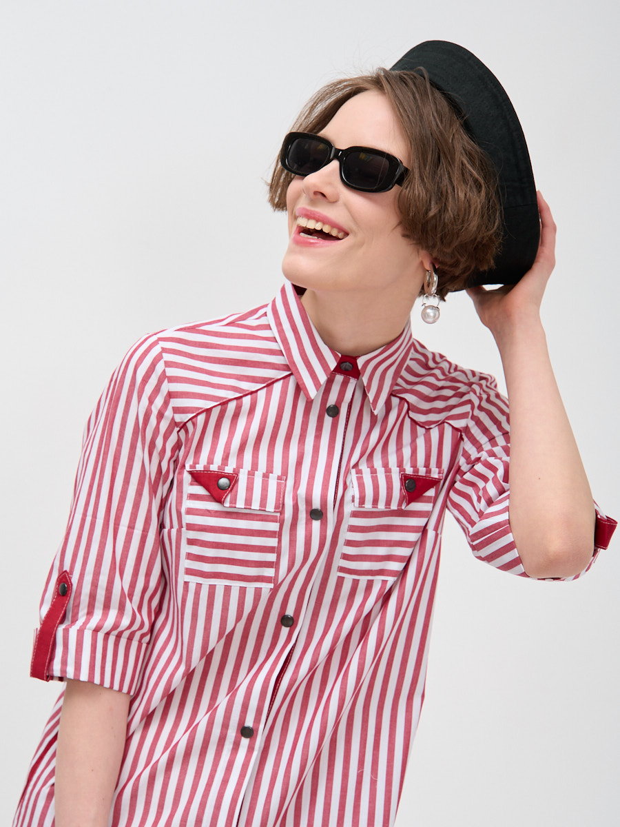 Представляем идеальное дополнение к ассортименту вашего бутика: элегантное платье-рубашка, выполненное с особым вниманием к деталям и качеству. Эта модель воплощает собой актуальные тренды и безупречный комфорт, что гарантирует высокий спрос среди ваших покупательниц.Особенности дизайна и пошива:Прямой силуэт обеспечивает универсальность и комфортную посадку, подходящую для различных типов фигур.Изготовлено из 100% высококачественного хлопка, что гарантирует приятные тактильные ощущения, воздухопроницаемость и долговечность изделия.Акцентные вертикальные полосы визуально вытягивают силуэт, а яркие контрастные вставки и окантовка по кокетке и карманам добавляют динамичности и современного шика.Фигурная кокетка по переду и классическая по спинке демонстрируют мастерство конструкторов и обеспечивают идеальную посадку плечевого пояса.Практичные накладные карманы с клапанами на груди и удобные прорезные карманы по бокам функционально дополняют дизайн.Длина рукава регулируется с помощью паты, позволяя носить платье как с коротким, так и с длинным рукавом.Это платье-рубашка идеально подходит для создания разнообразных образов – от повседневных до элегантных городских. Инвестируйте в качество и стиль, предлагая своим клиентам продукцию, которая выделяется на рынке и приносит прибыль.Рекомендации по уходу: Машинная деликатная стирка.
